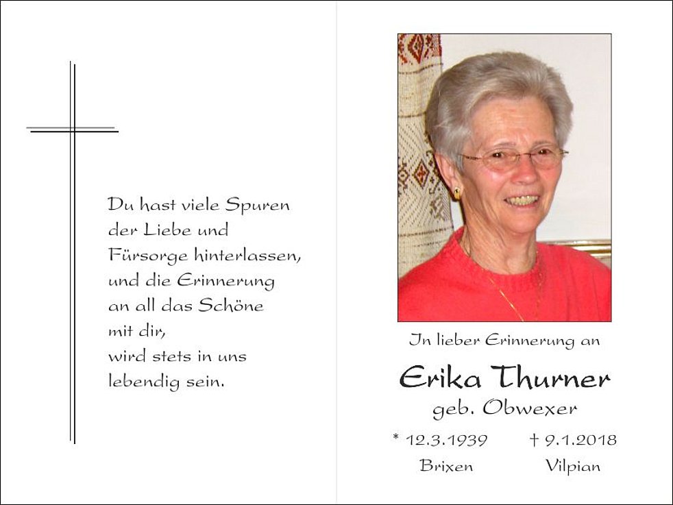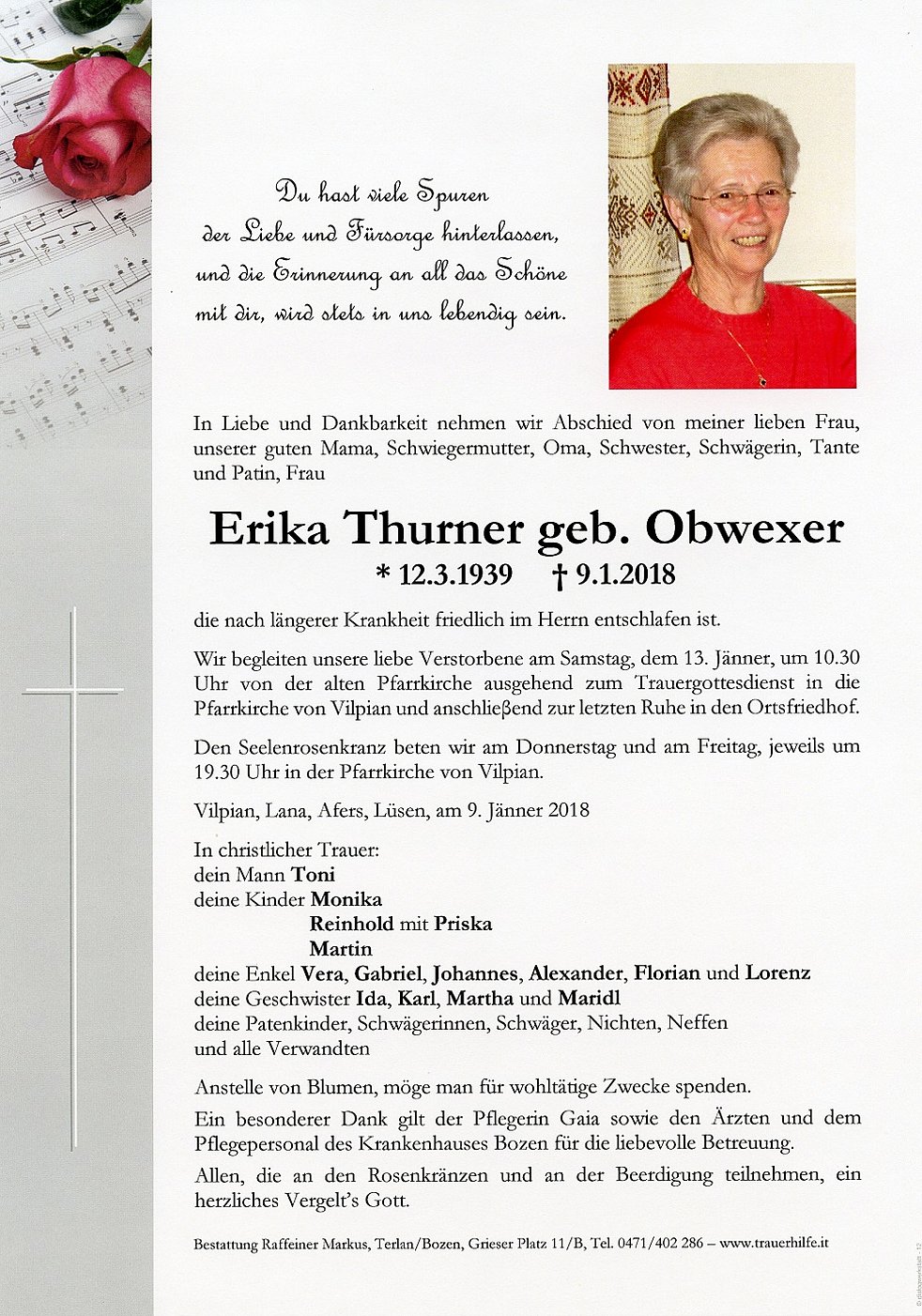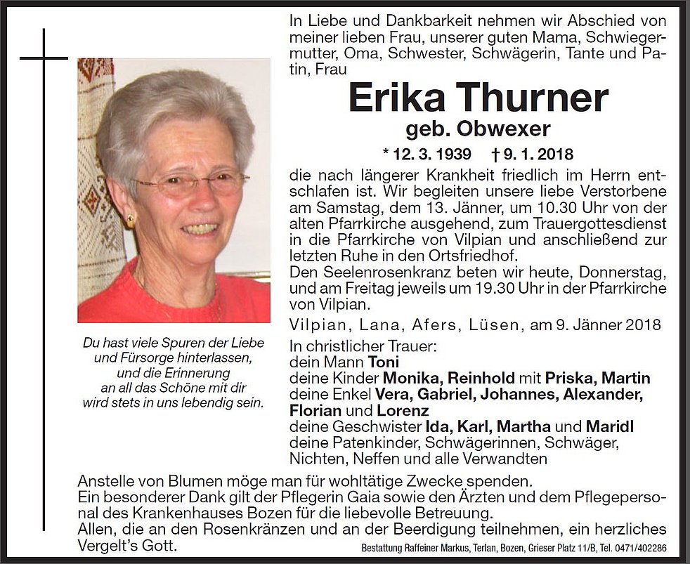 Wir begleiten unsere liebe Verstorbene am Samstag, dem 13. Jänner, um 10.30 Uhr von der alten Pfarrkirche ausgehend zum Trauergottesdienst in die Pfarrkirche von Vilpian und anschlieβend zur letzten Ruhe in den Ortsfriedhof.