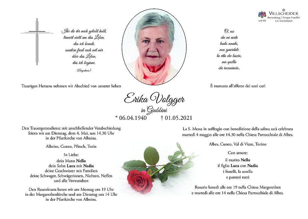 Trauerfeier: 04.05. - 14:30 Uhr Albeins; Albes