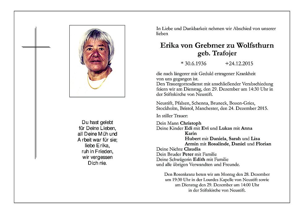 Den Trauergottesdienst mit anschließender Verabschiedung feiern wir am Dienstag, den 29. Dezember um 14:30 Uhr in der Stiftskirche von Neustift.