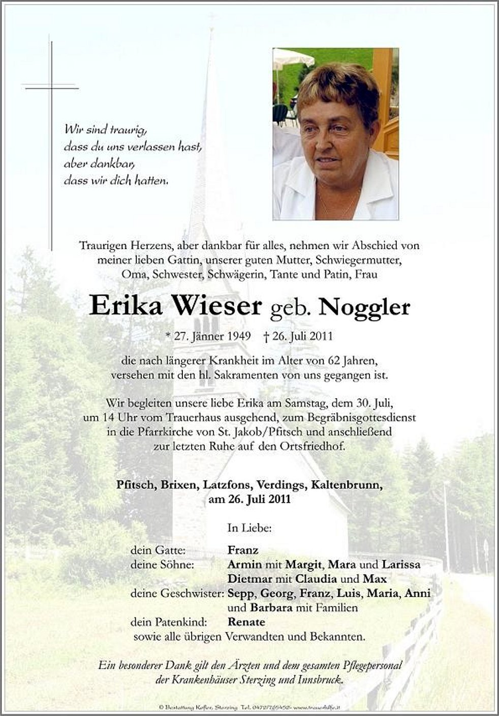 Wir begleiten unsere liebe Erika am Samstag, dem 30. Juli, um 14 Uhr