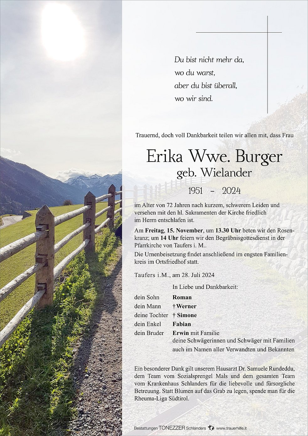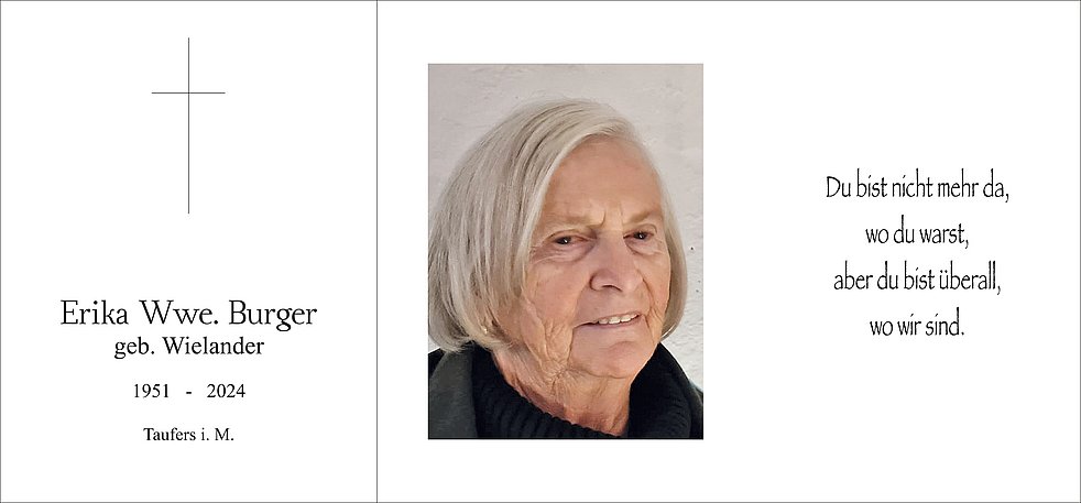 Am Freitag, 15. November, um 13.30 Uhr beten wir den Rosenkranz; um 14 Uhr feiern wir den Begräbnisgottesdienst in der Pfarrkirche von Taufers i. M..