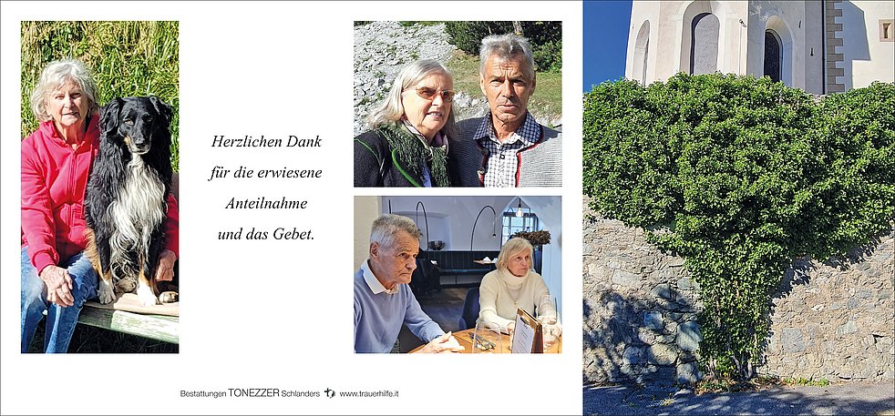 Ein besonderer Dank gilt unserem Hausarzt Dr. Samuele Rundeddu, dem Team vom Sozialsprengel Mals und dem gesamten Team vom Krankenhaus Schlanders für die liebevolle und fürsorgliche Betreuung.