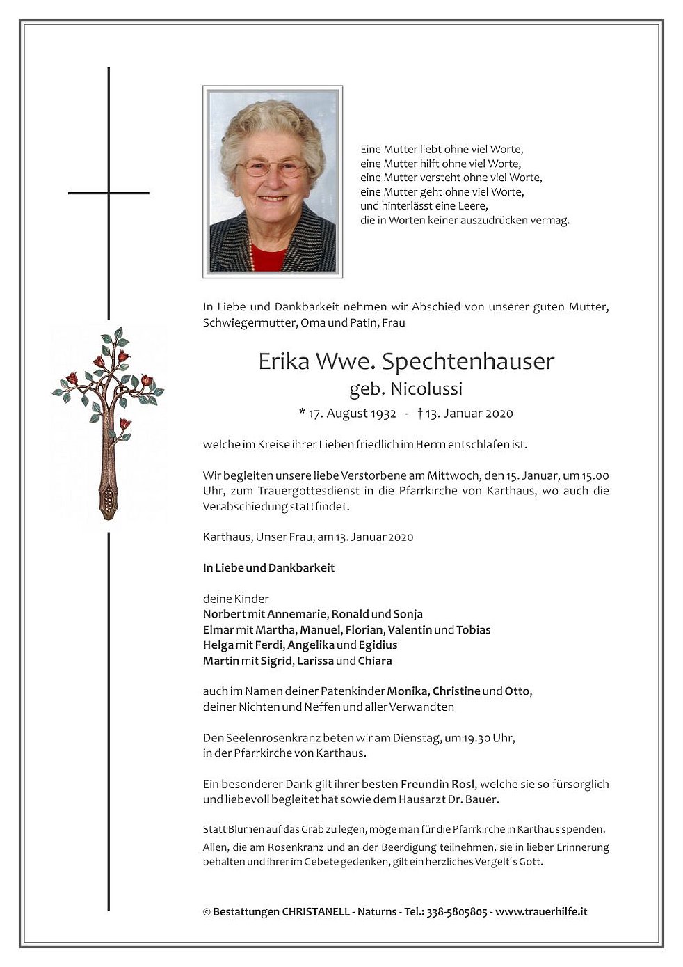 Wir begleiten unsere liebe Verstorbene am Mittwoch, den 15. Januar, um 15.00 Uhr, zum Trauergottesdienst in die Pfarrkirche von Karthaus, wo auch die Verabschiedung stattfindet.