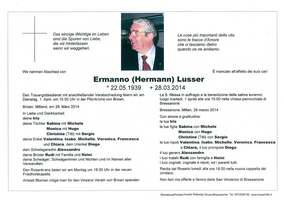 Anstatt Blumen möge man für den Vinzenz Verein von Brixen spenden.