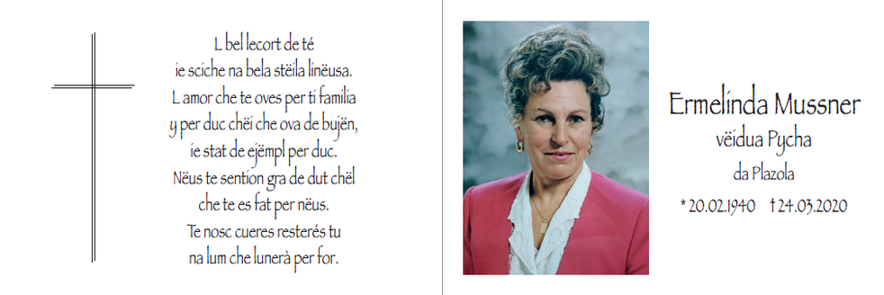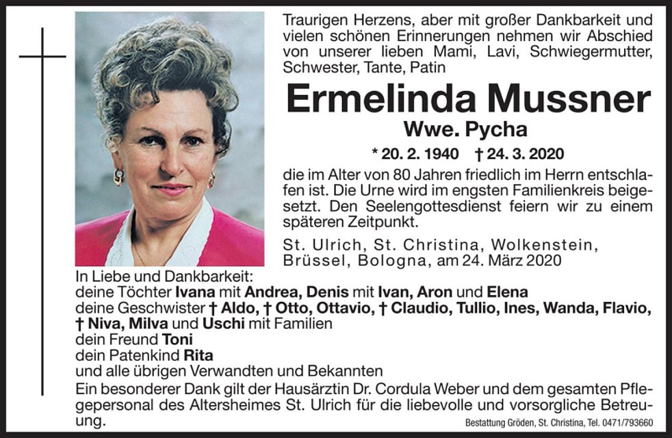 Ein besonderer Dank gilt der Hausärztin Dr. Cordula Weber und dem gesamten Pflegepersonal des Altersheimes St. Ulrich für die liebevolle und fürsorgliche Betreuung.