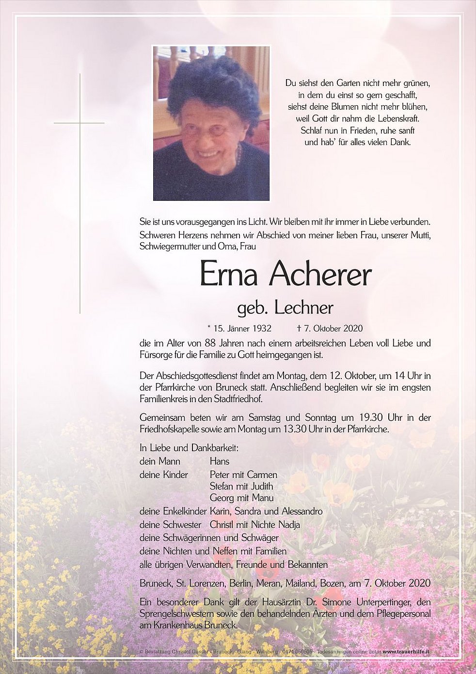Der Abschiedsgottesdienst findet am Montag, dem 12. Oktober, um 14 Uhr in der Pfarrkirche von Bruneck statt. Anschließend begleiten wir sie im engsten Familienkreis in den Stadtfriedhof.