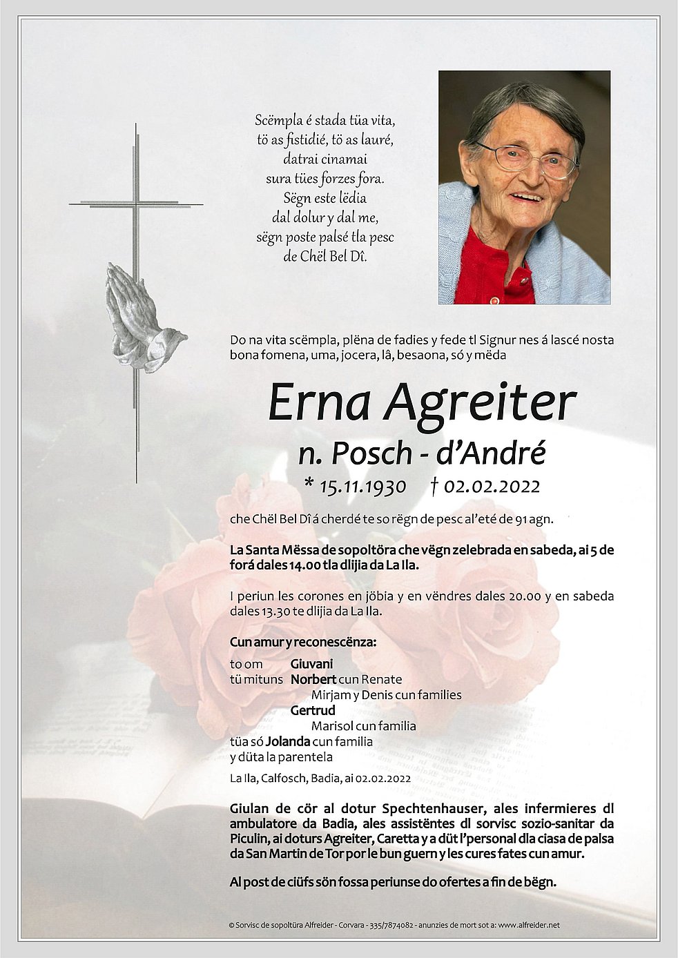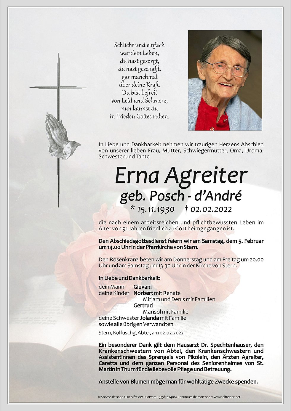 Ein besonderer Dank gilt dem Hausarzt Dr. Spechtenhauser, den Krankenschwestern von Abtei, den Krankenschwestern und Assistentinnen des Sprengels von Pikolein, den Ärzten Agreiter, Caretta und dem ganzen Personal des Seniorenheimes von St. Martin in Thurn für die liebevolle Pflege und Betreuung.