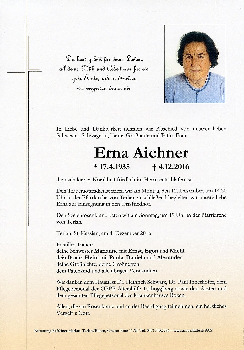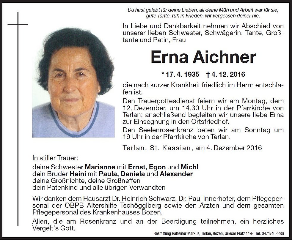 Den Trauergottesdienst feiern wir am Montag, den 12. Dezember, um 14.30 Uhr in der Pfarrkirche von Terlan; anschließend begleiten wir unsere liebe Erna zur Einsegnung in den Ortsfriedhof.