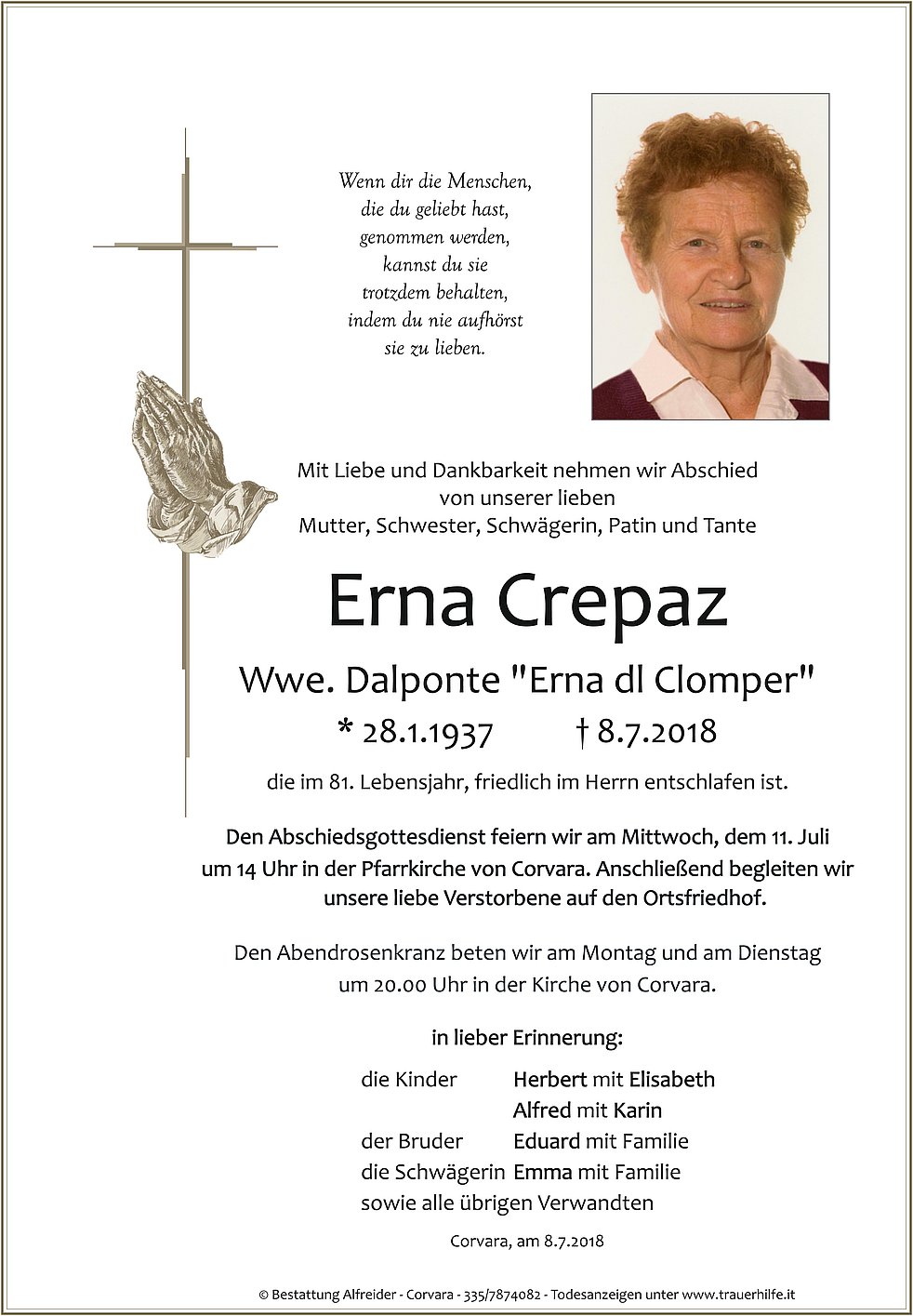 Den Abschiedsgottesdienst feiern wir am Mittwoch, dem 11. Juli um 14 Uhr in der Pfarrkirche von Corvara. Anschließend begleiten wir unsere liebe Verstorbene auf den Ortsfriedhof.