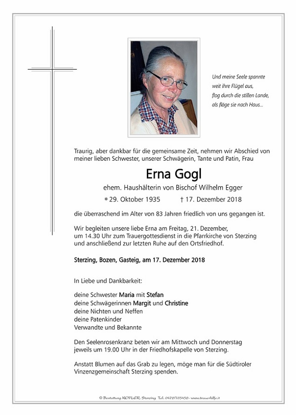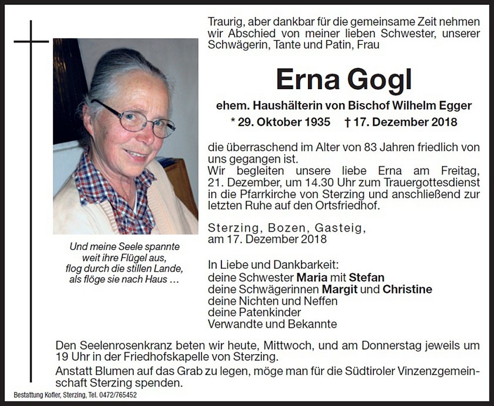 Wir begleiten unsere liebe Erna am Freitag, 21. Dezember, um 14.30 Uhr zum Trauergottesdienst in die Pfarrkirche von Sterzing und anschließend zur letzten Ruhe auf den Ortsfriedhof.