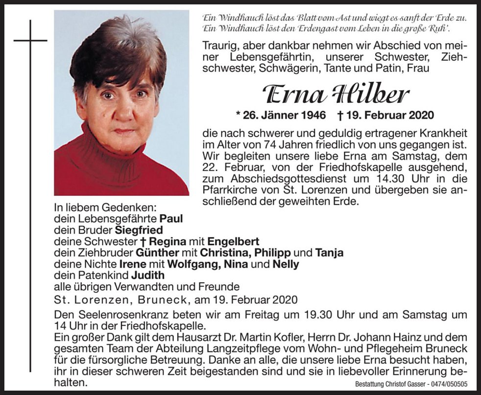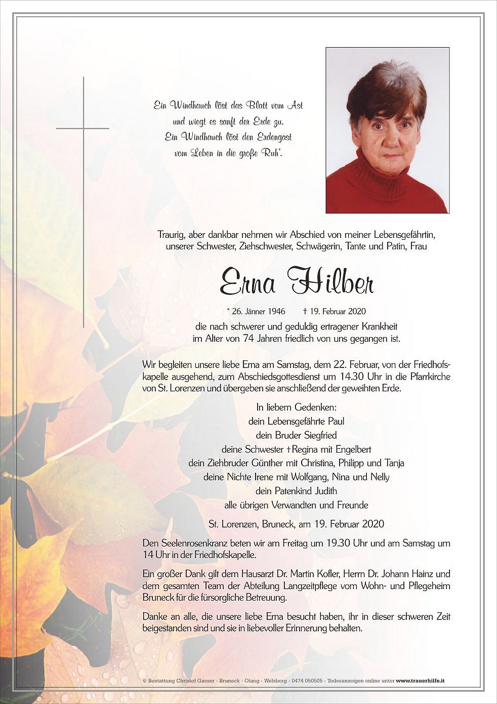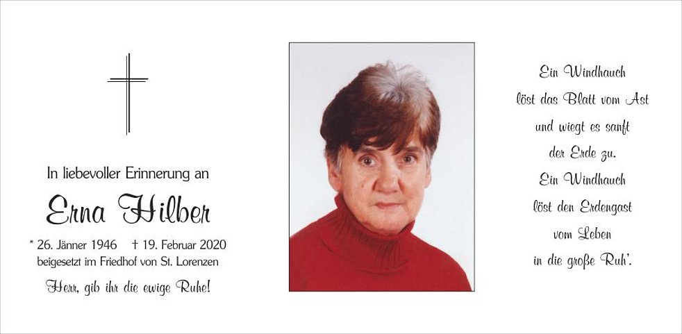 Wir begleiten unsere liebe Erna am Samstag, dem 22. Februar, von der Friedhofskapelle ausgehend, zum Abschiedsgottesdienst um 14.30 Uhr in die Pfarrkirche von St. Lorenzen und übergeben sie anschließend der geweihten Erde.