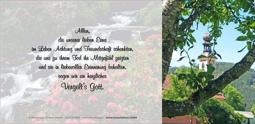 Ein großer Dank gilt dem Hausarzt Dr. Martin Kofler, Herrn Dr. Johann Hainz und dem gesamten Team der Abteilung Langzeitpflege vom Wohn- und Pflegeheim Bruneck für die fürsorgliche Betreuung.