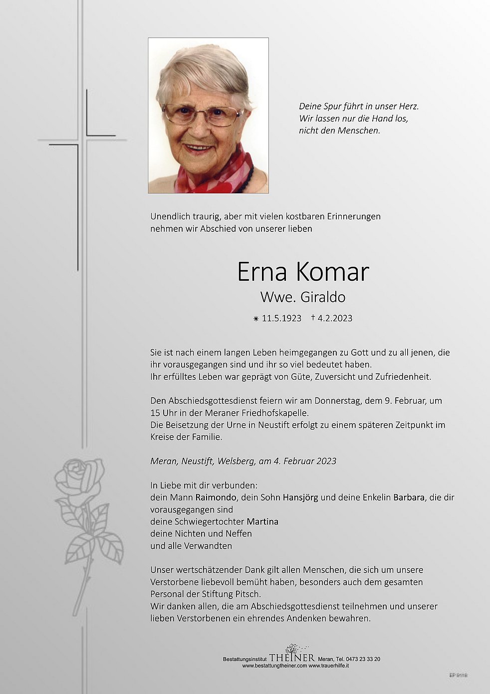 Den Abschiedsgottesdienst feiern wir am Donnerstag, dem 9. Februar, um 15 Uhr in der Meraner Friedhofskapelle.
