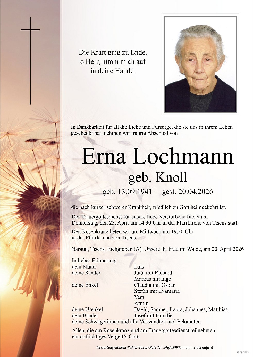 Begräbnisgottesdienst: 23.04. - 14:30 Uhr Pfarrkirche Tisens