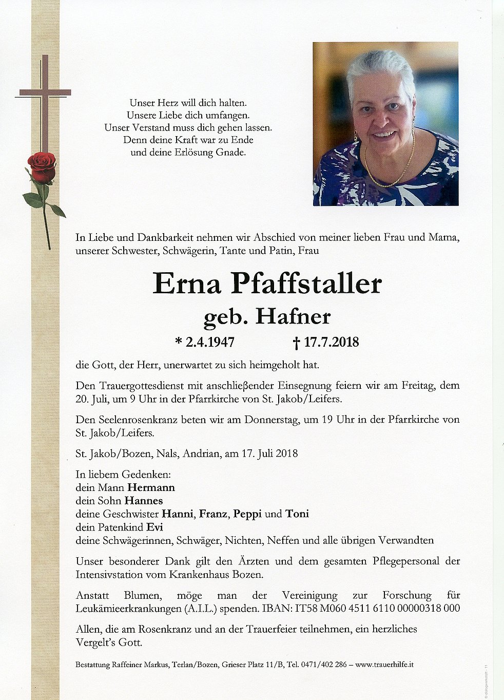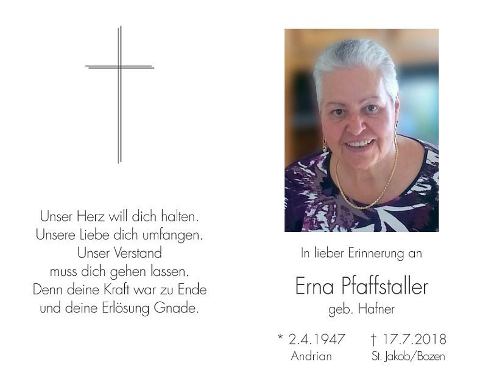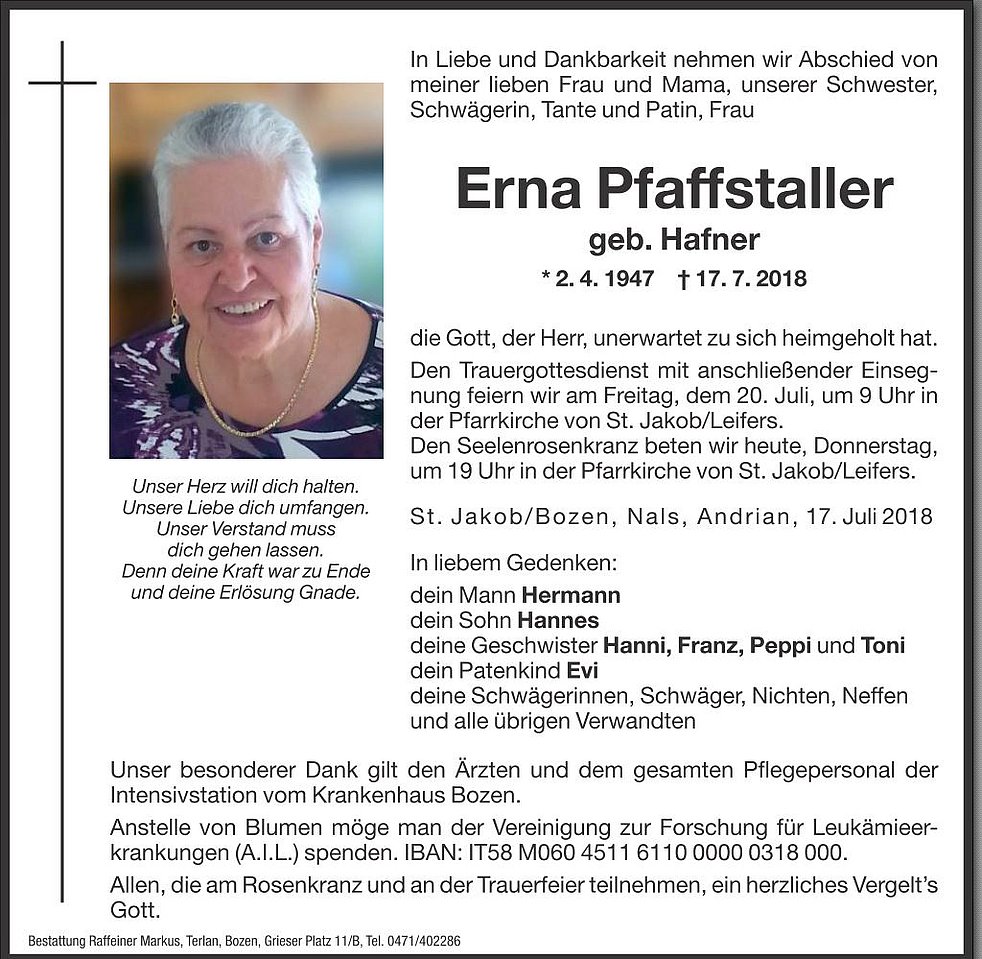 Den Trauergottesdienst mit anschlieβender Einsegnung feiern wir am Freitag, dem 20. Juli, um 9 Uhr in der Pfarrkirche von St. Jakob/Leifers.