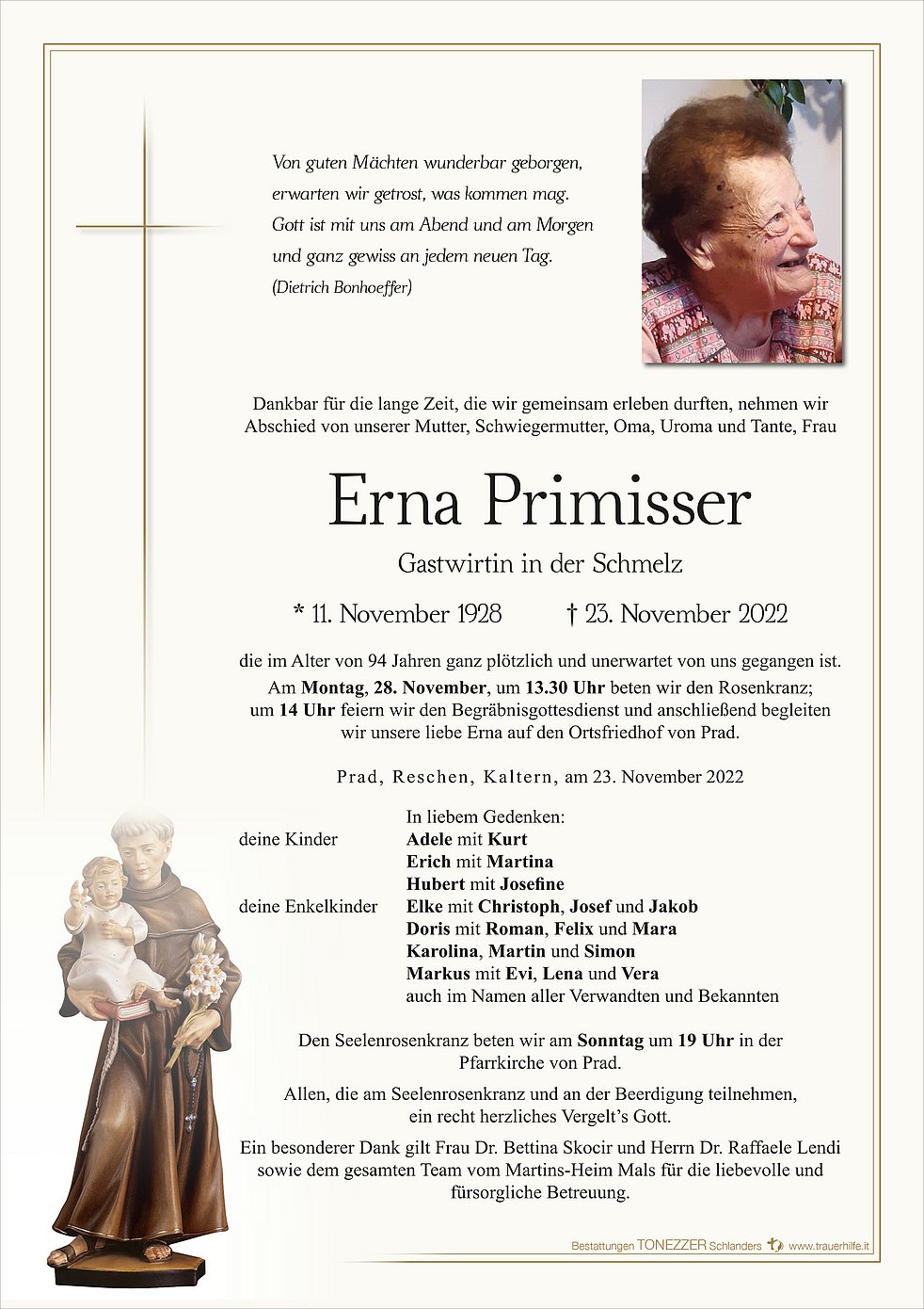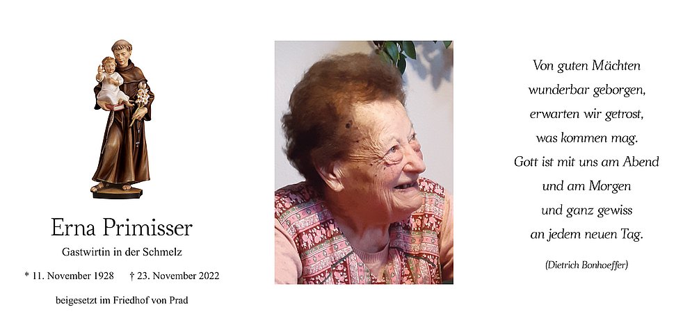 Am Montag, 28. November, um 13.30 Uhr beten wir den Rosenkranz; um 14 Uhr feiern wir den Begräbnisgottesdienst und anschließend begleiten wir unsere liebe Erna auf den Ortsfriedhof von Prad.