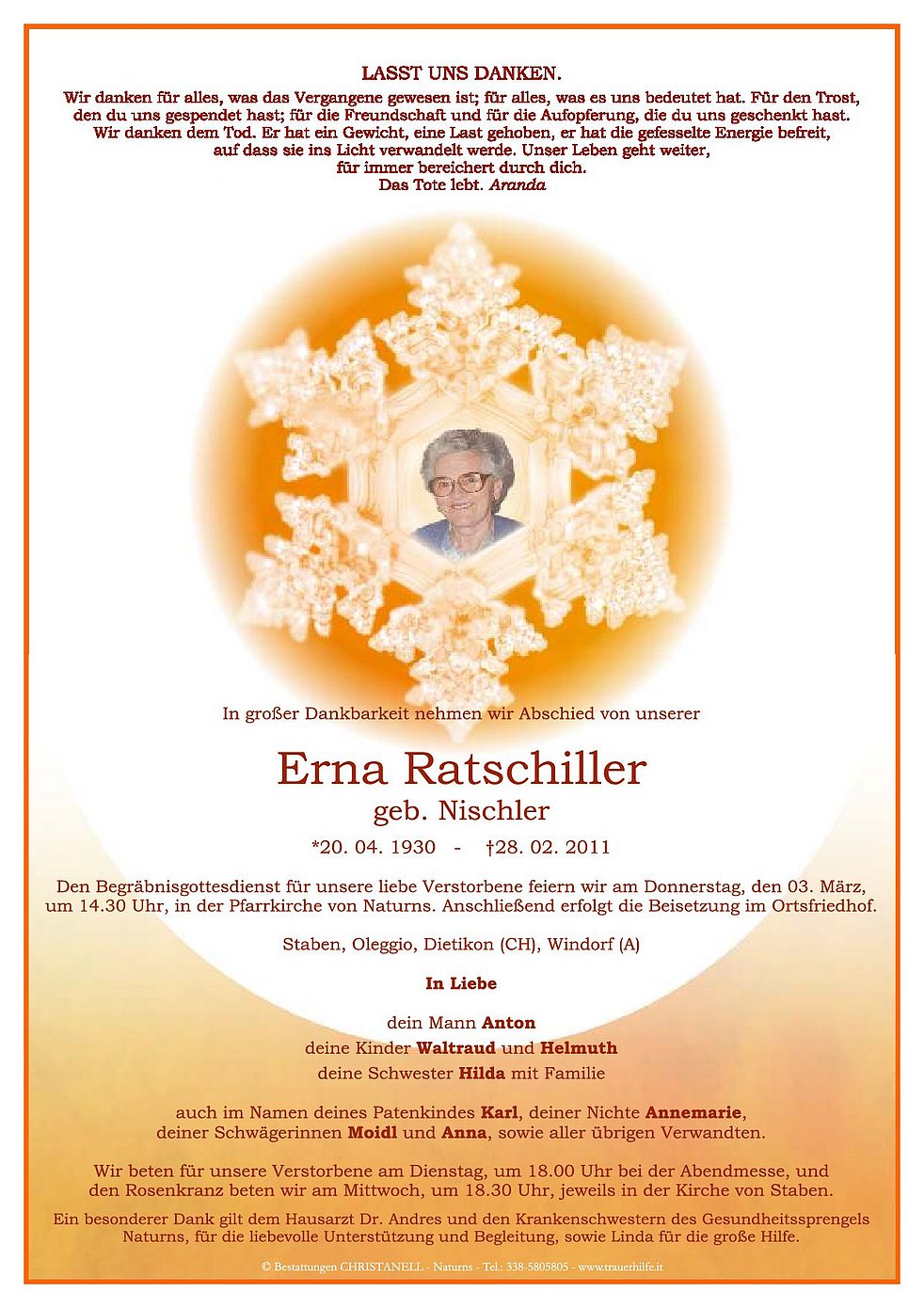 Den Begräbnisgottesdienst für unsere liebe Verstorbene feiern wir am Donnerstag, den 03. März, um 14.30 Uhr, in der Pfarrkirche von Naturns. Anschließend erfolgt die Beisetzung im Ortsfriedhof.