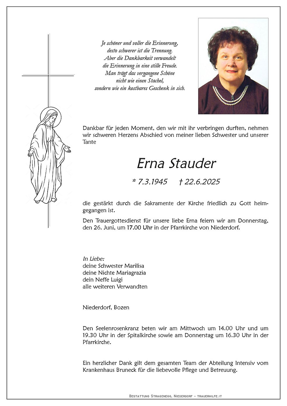 Begräbnisgottesdienst: 26.06. - 17:00 Uhr Niederdorf