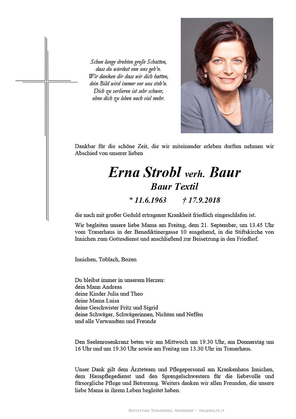 Wir begleiten unsere liebe Mama am Freitag, dem 21. September, um 13.45 Uhr vom Trauerhaus in der Benediktinergasse 10 ausgehend, in die Stiftskirche von Innichen zum Gottesdienst und anschließend zur Beisetzung in den Friedhof.