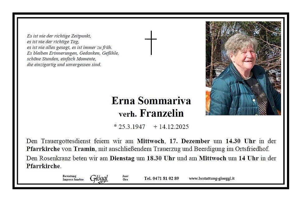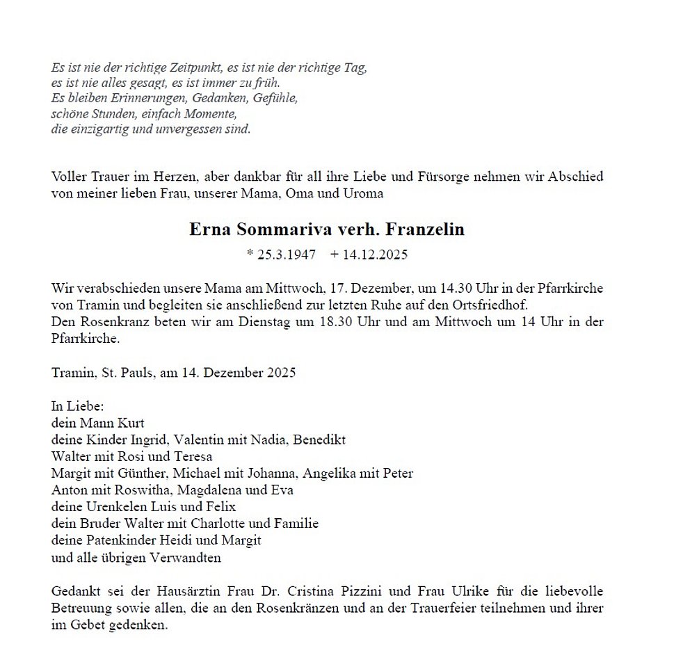 Trauerfeier: 17.12. - 14:30 Uhr TRAMIN