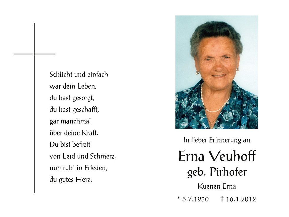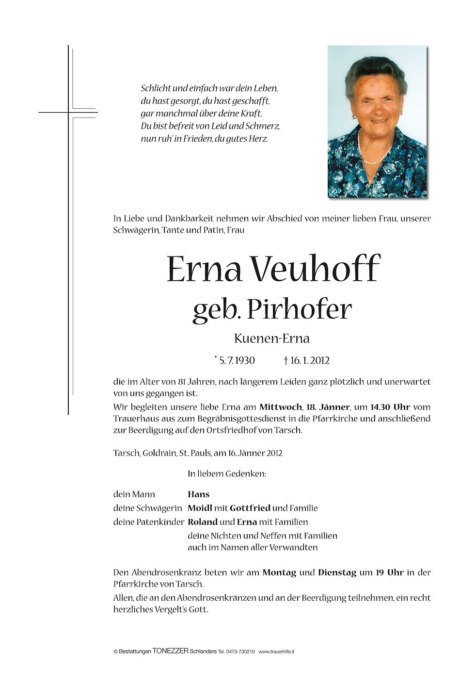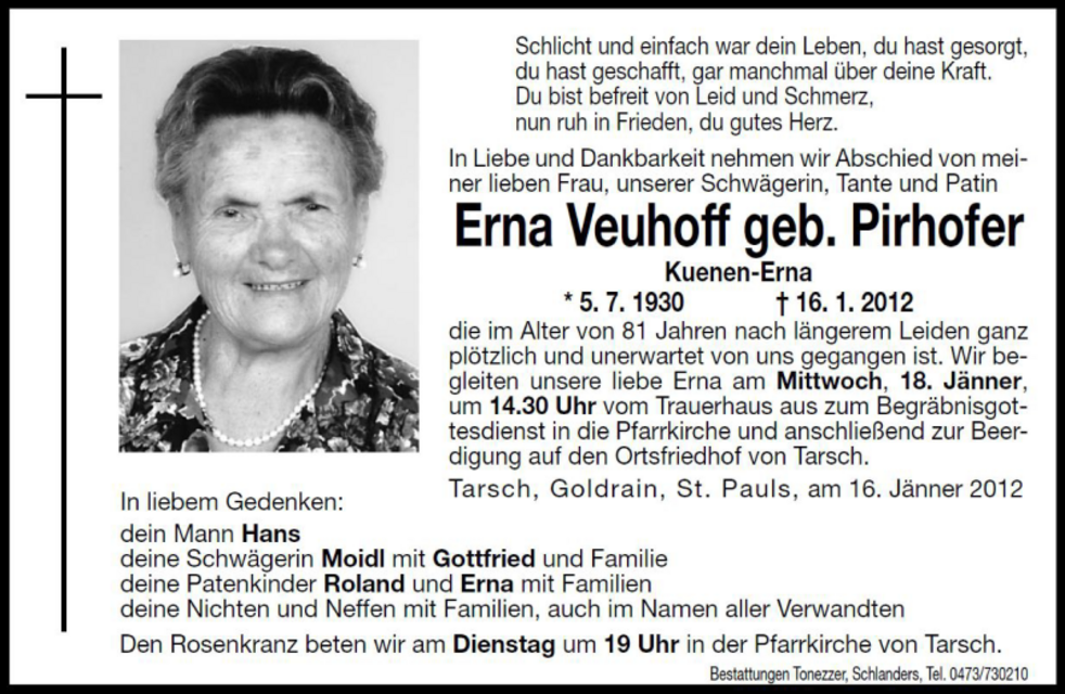 Wir begleiten unsere liebe Erna am Mittwoch, 18. Jänner, um 14.30 Uhr vom Trauerhaus aus zum Begräbnisgottesdienst in die Pfarrkirche und anschließend zur Beerdigung auf den Ortsfriedhof von Tarsch.