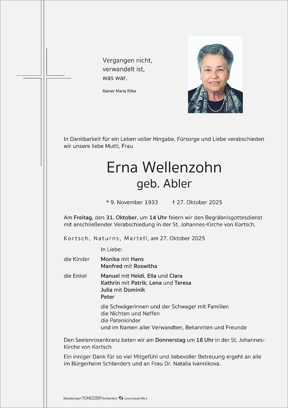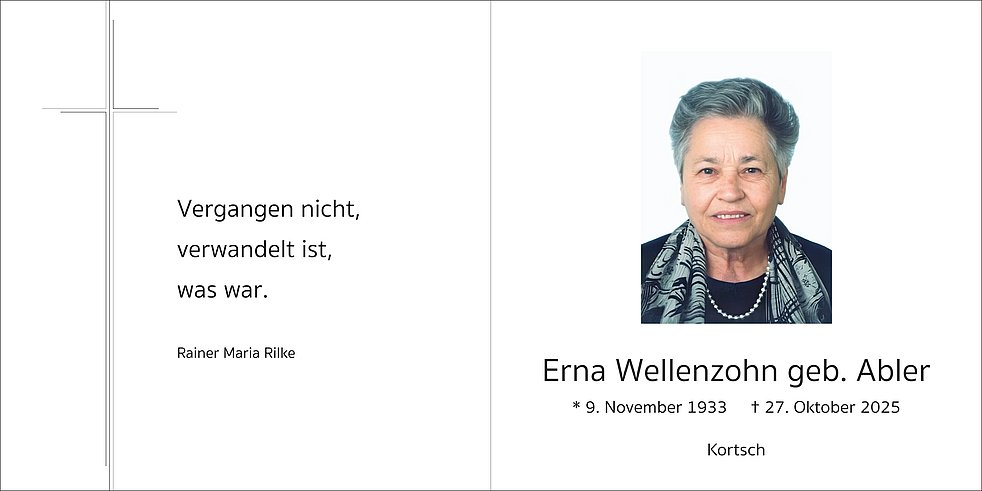 Am Freitag, den 31. Oktober, um 14 Uhr feiern wir den Begräbnisgottesdienst mit anschließender Verabschiedung in der St. Johannes-Kirche von Kortsch.