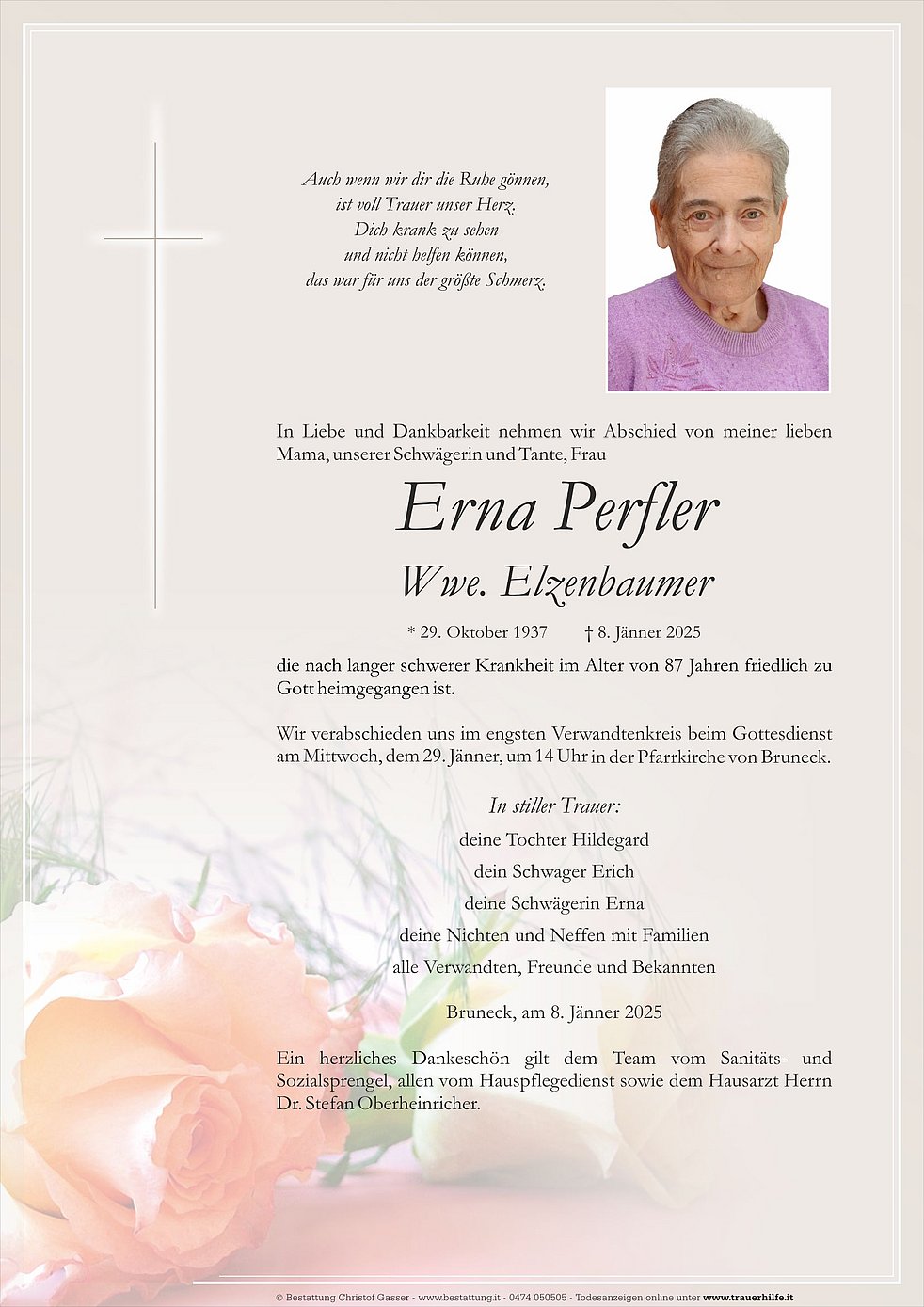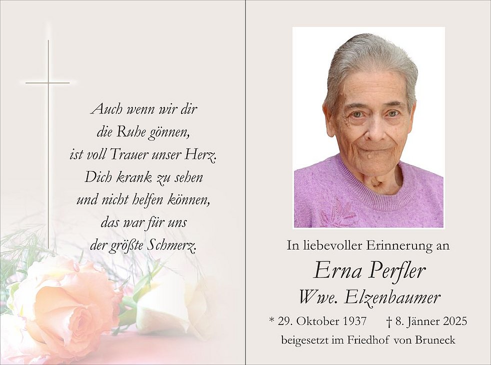 Wir verabschieden uns im engsten Verwandtenkreis beim Gottesdienst am Mittwoch, dem 29. Jänner, um 14 Uhr in der Pfarrkirche von Bruneck.