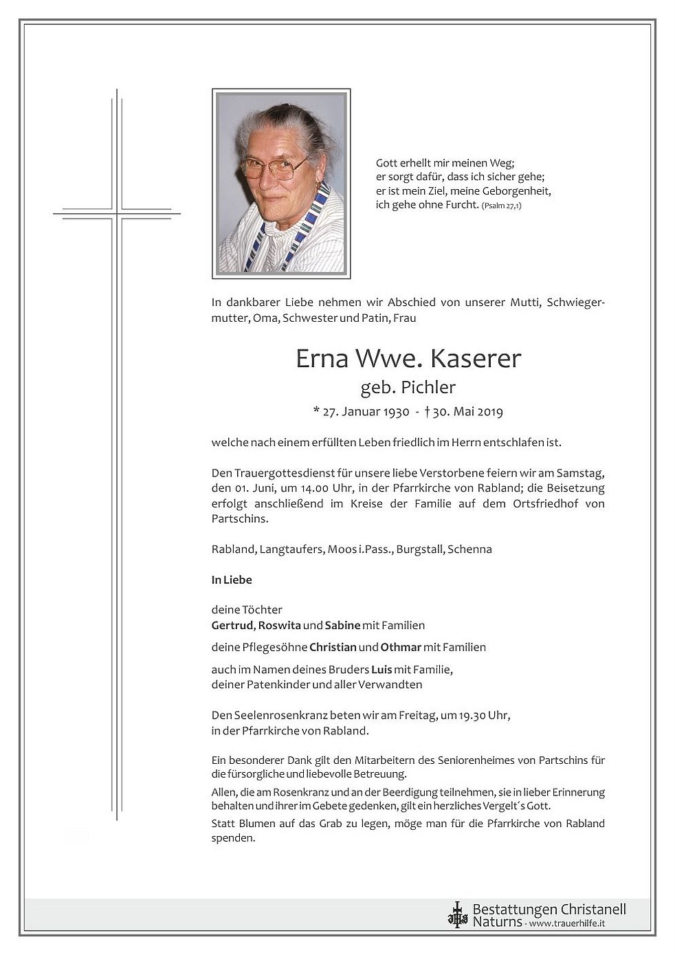 Den Trauergottesdienst für unsere liebe Verstorbene feiern wir am Samstag, den 01. Juni, um 14.00 Uhr, in der Pfarrkirche von Rabland; die Beisetzung erfolgt anschließend im Kreise der Familie auf dem Ortsfriedhof von Partschins.