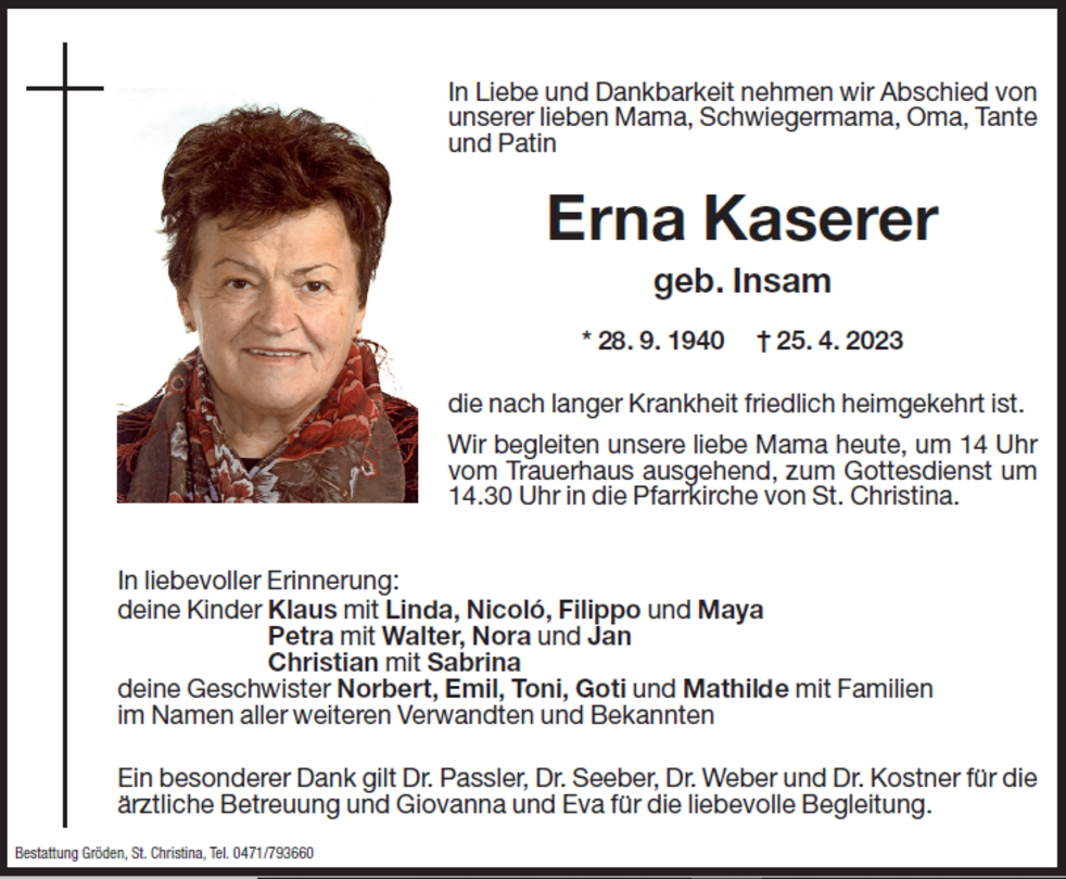 Wir begleiten unsere liebe Mama am Donnerstag, dem 27. April, um 14 Uhr vom Trauerhaus ausgehend, zum Gottesdienst um 14.30 Uhr in die Pfarrkirche von St. Christina.