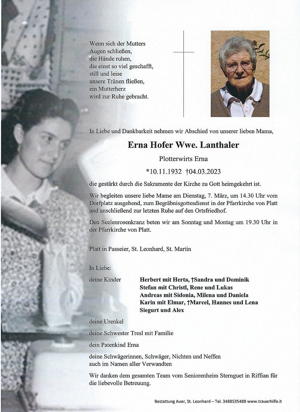 Wir begleiten unsere liebe Mame am Dienstag, 7. März, um 14.30 Uhr vom Dorfplatz ausgehend, zum Begräbnisgottesdienst in der Pfarrkirche von Platt und anschließend zur letzten Ruhe auf den Ortsfriedhof.