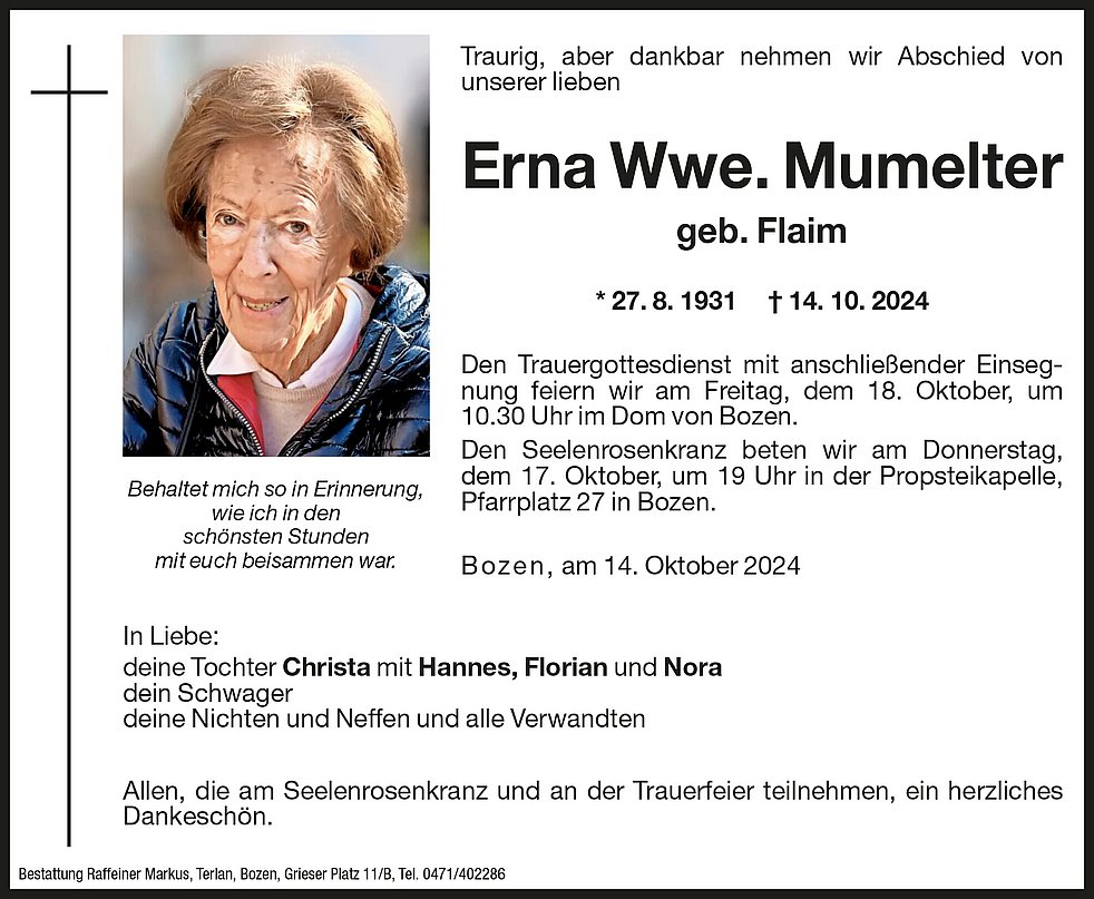 Den Trauergottesdienst mit anschließender Einsegnung feiern wir am Freitag, dem 18. Oktober, um 10.30 Uhr im Dom von Bozen.