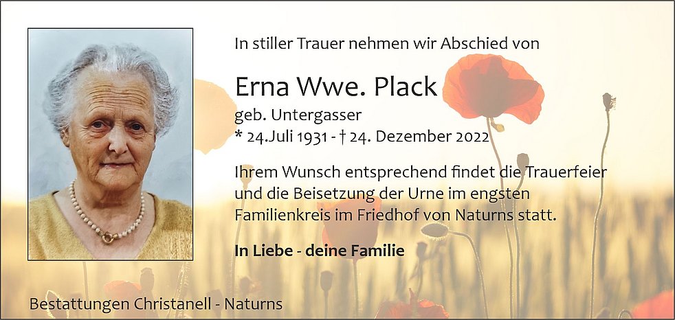 Ihrem Wunsch entsprechend findet die Trauerfeier und die Beisetzung der Urne im engsten Familienkreis im Friedhof von Naturns statt.