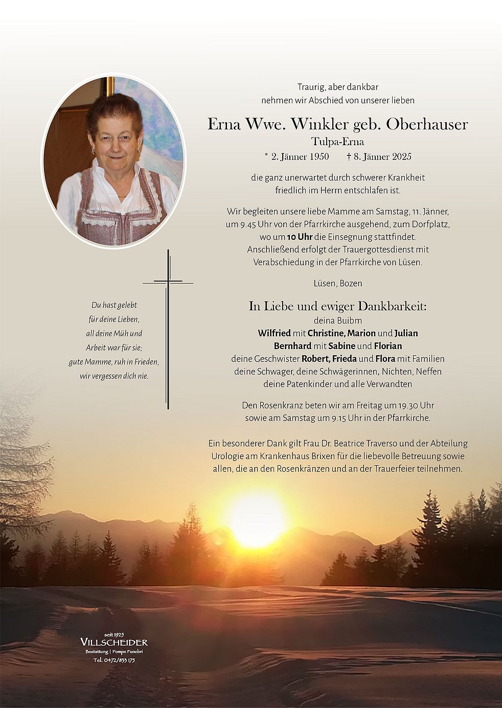 Begräbnisgottesdienst: 11.01. - 10:00 Uhr Lüsen