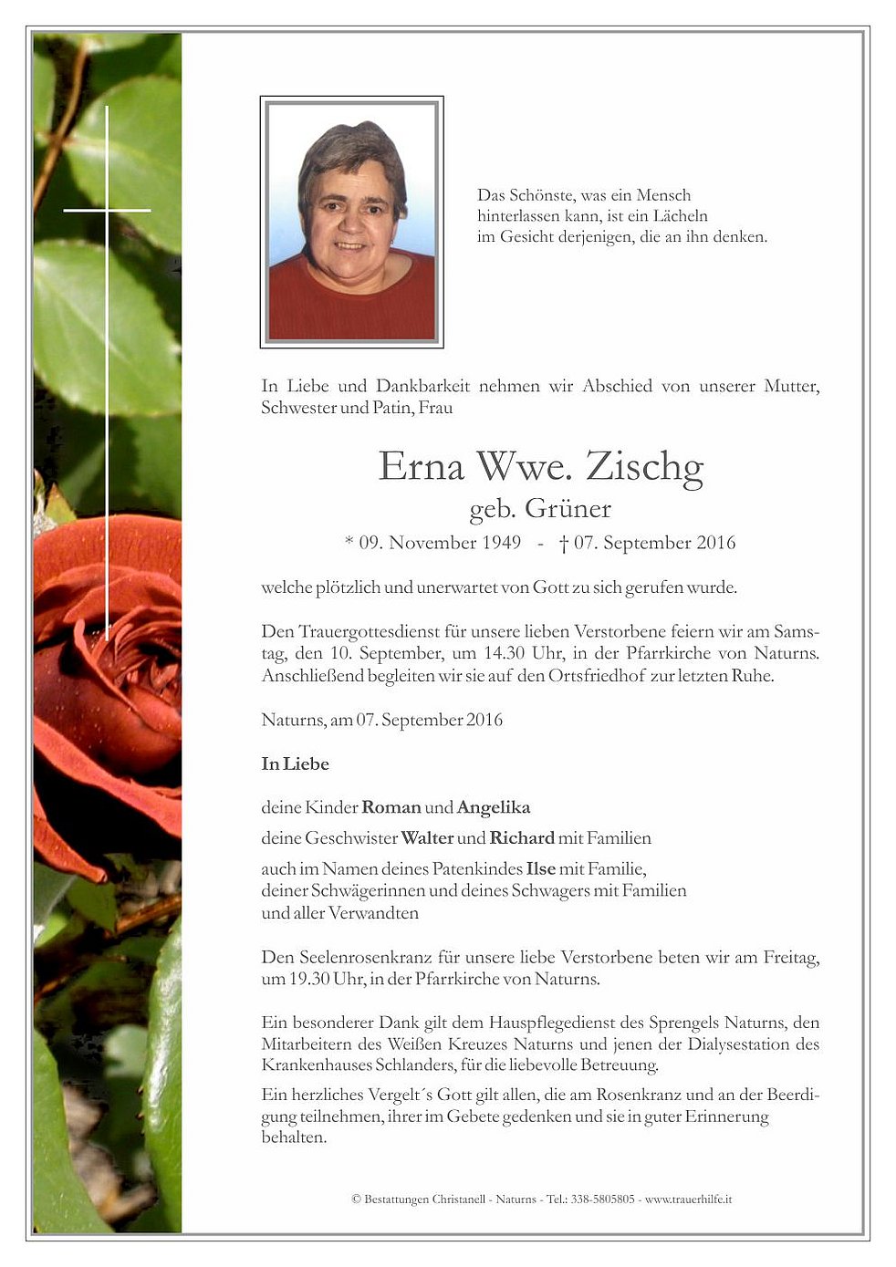 Den Trauergottesdienst für unsere lieben Verstorbene feiern wir am Samstag, den 10. September, um 14.30 Uhr, in der Pfarrkirche von Naturns. Anschließend begleiten wir sie auf den Ortsfriedhof zur letzten Ruhe.