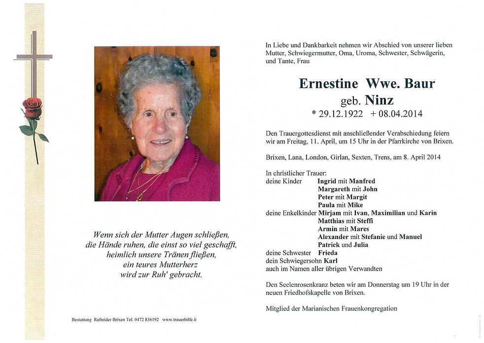 Gedankt sei dem Hausarzt Dr. Niederstätter und dem Pflegepersonal des Bürgerheimes, 3. Wohnbereich, für die liebevolle Betreuung.