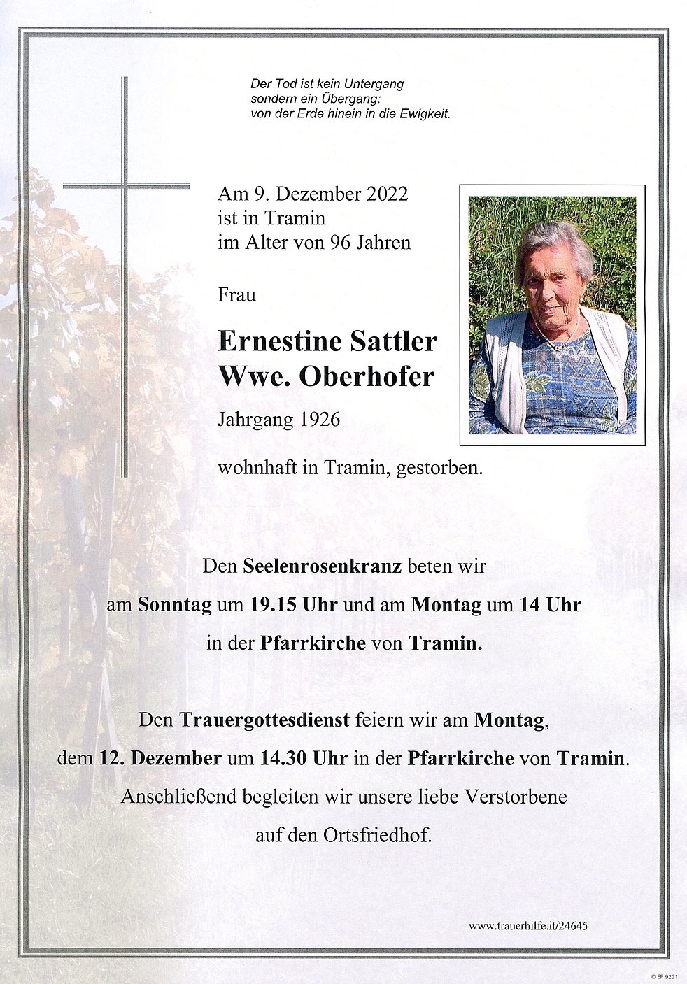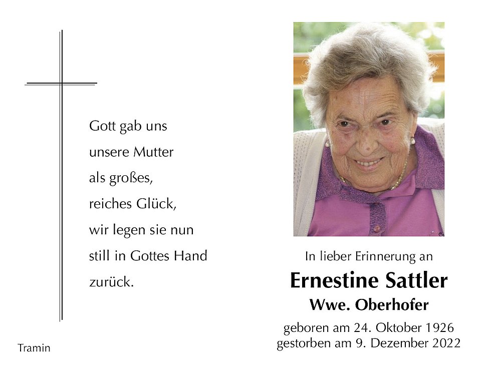 Den Trauergottesdienst feiern wir am Montag, dem 12. Dezember um 14.30 Uhr in der Pfarrkirche von Tramin. Anschließend begleiten wir unsere liebe Verstorbene auf den Ortsfriedhof.