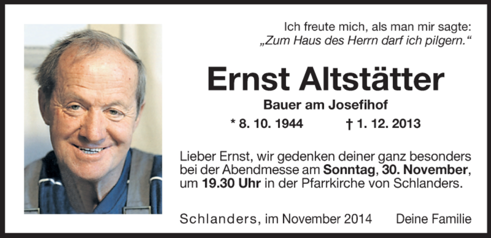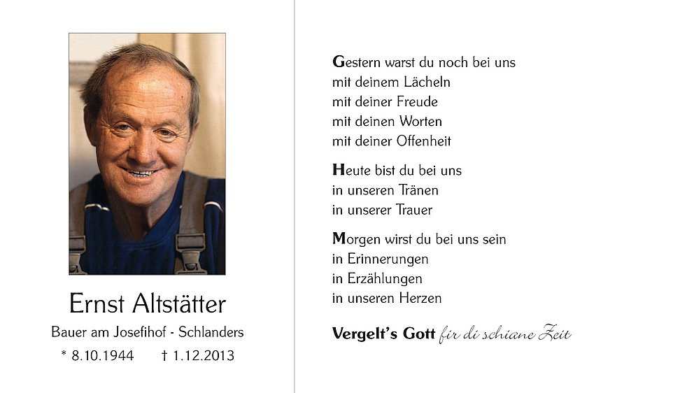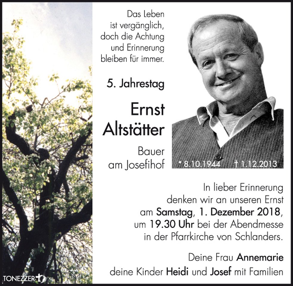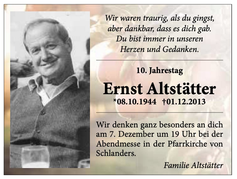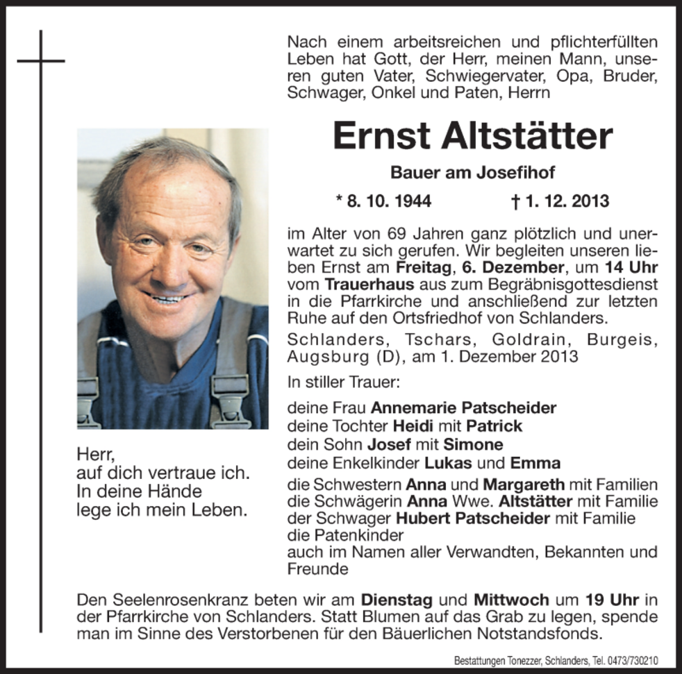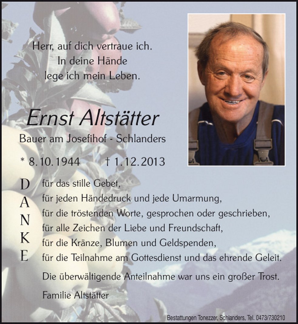 Wir begleiten unseren lieben Ernst am Freitag, 6. Dezember, um 14 Uhr vom Trauerhaus aus zum Begräbnisgottesdienst in die Pfarrkirche und anschließend zur letzten Ruhe auf den Ortsfriedhof von Schlanders.