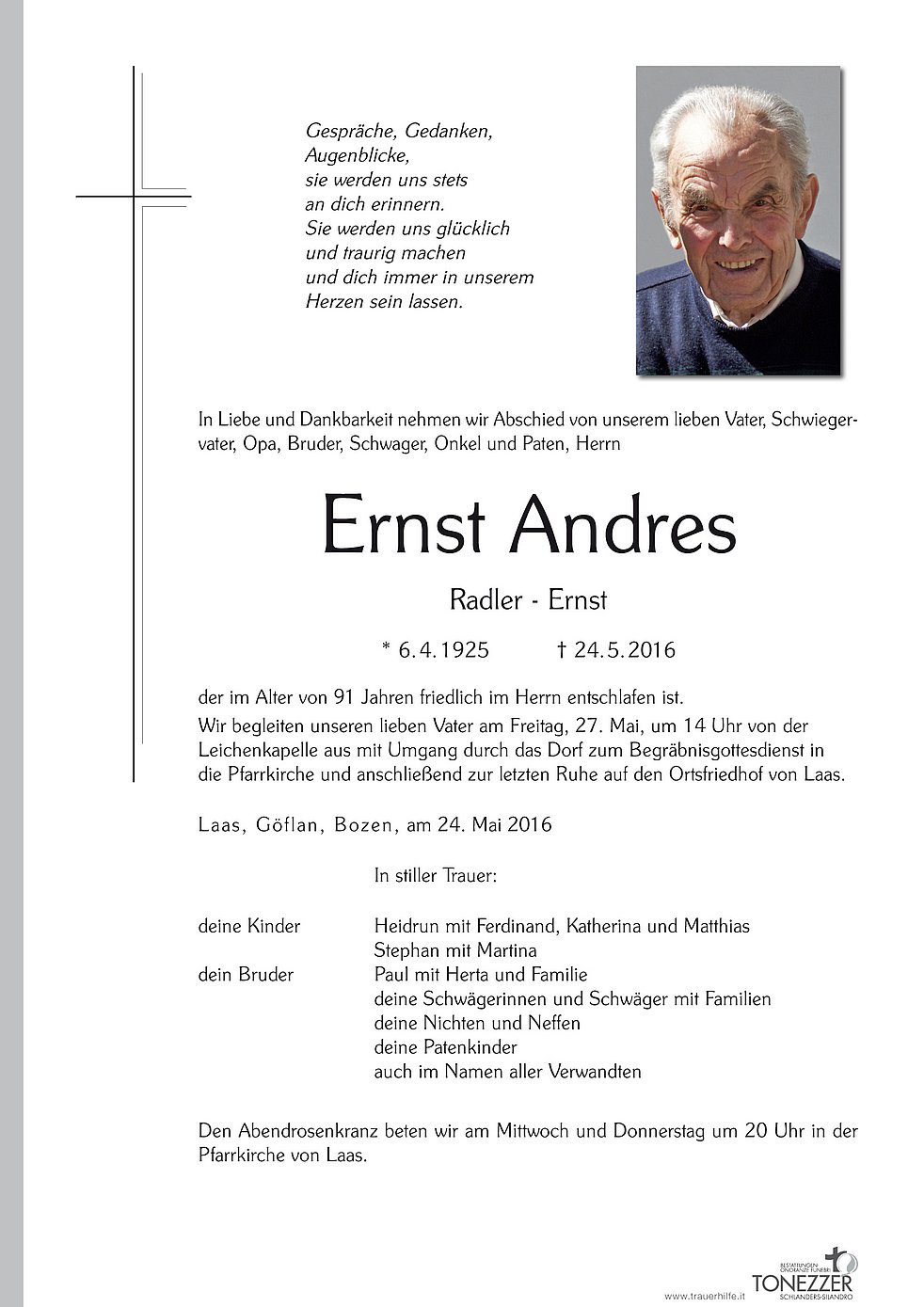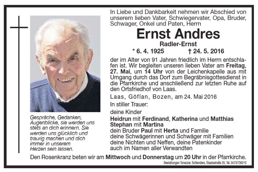 Wir begleiten unseren lieben Vater am Freitag, 27. Mai, um 14 Uhr von der Leichenkapelle aus mit Umgang durch das Dorf zum Begräbnisgottesdienst in die Pfarrkirche und anschließend zur letzten Ruhe auf den Ortsfriedhof von Laas.