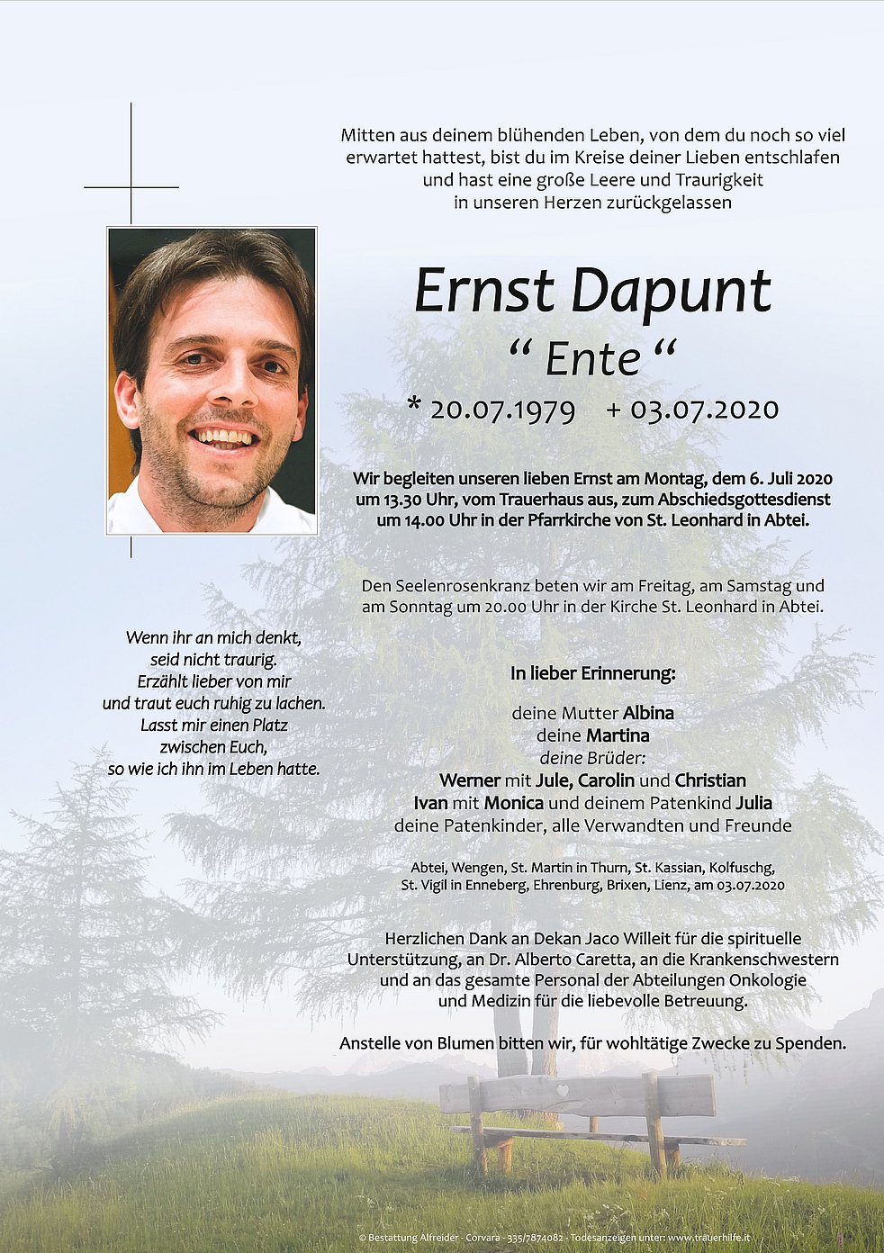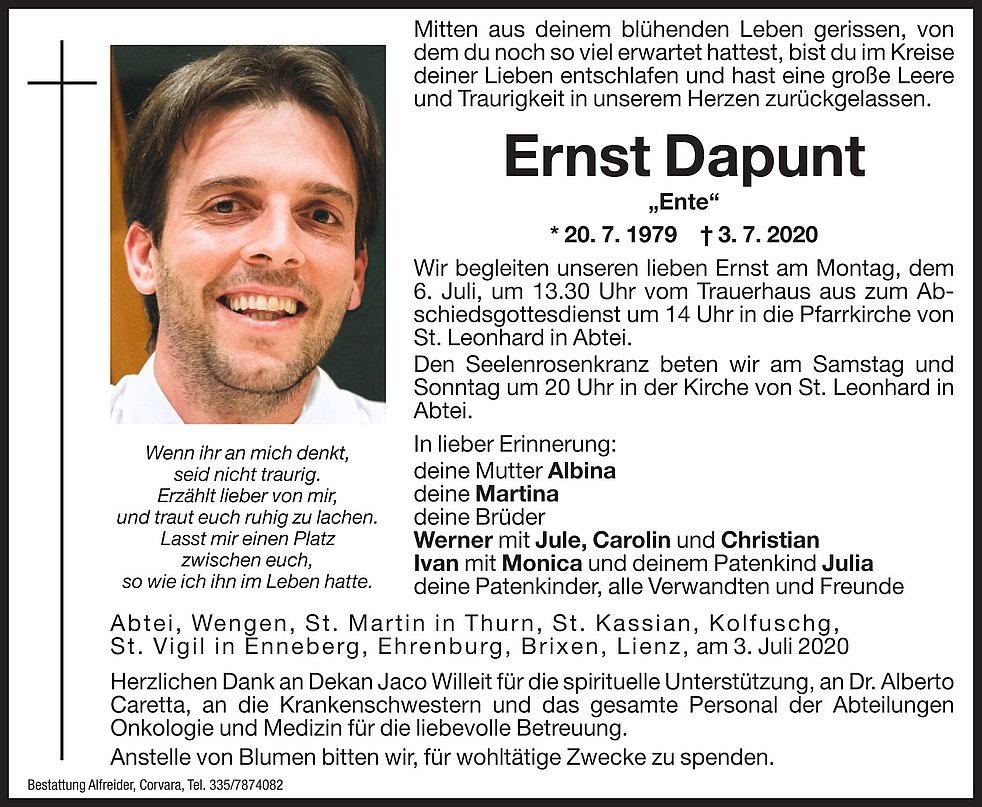 Wir begleiten unseren lieben Ernst am Montag, dem 6. Juli 2020 um 13.30 Uhr, vom Trauerhaus aus, zum Abschiedsgottesdienst um 14.00 Uhr in der Pfarrkirche von St. Leonhard in Abtei.