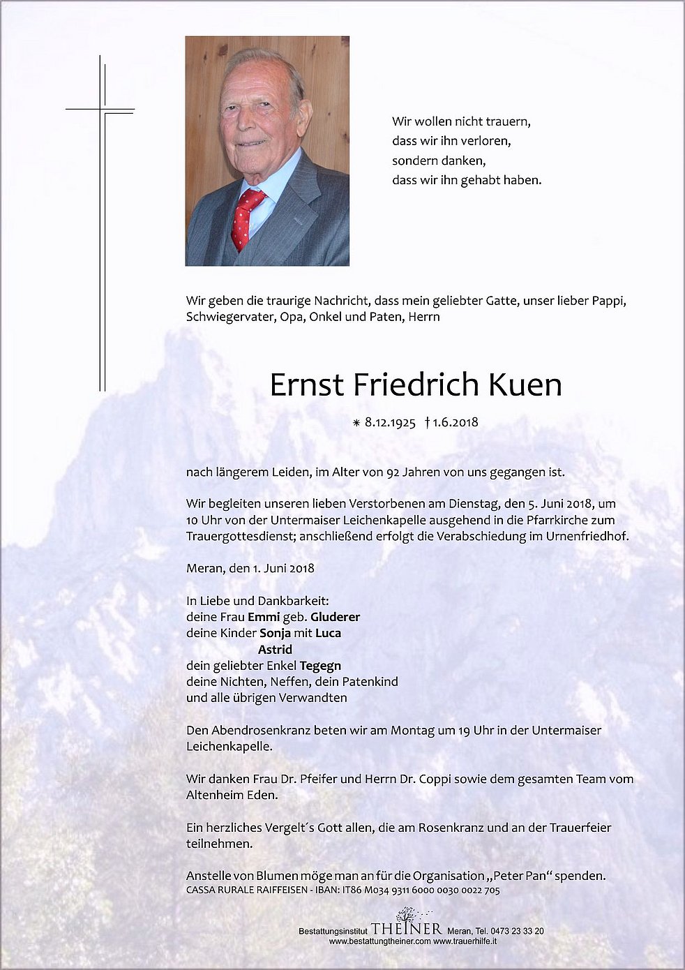 Ne danno il triste annuncio la moglie Emmi nata Gluderer, le figlie Sonja con Luca e Astrid, il nipote Tegegn e parenti tutti.