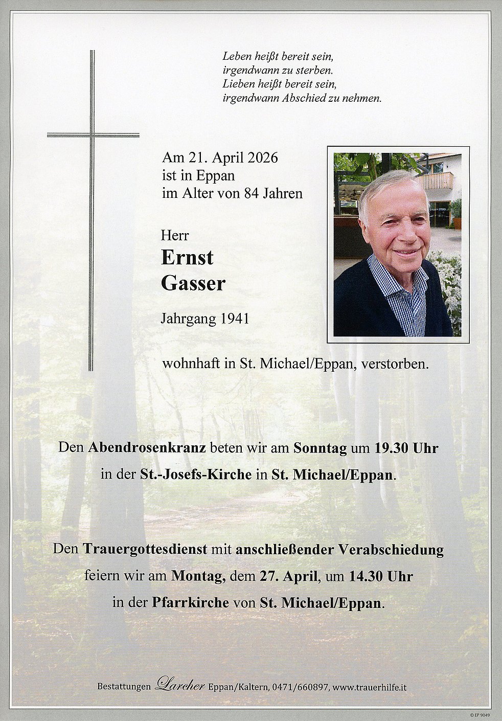 Den Trauergottesdienst mit anschließender Verabschiedung feiern wir am Montag, dem 27. April, um 14.30 Uhr in der Pfarrkirche von St. Michael/Eppan.