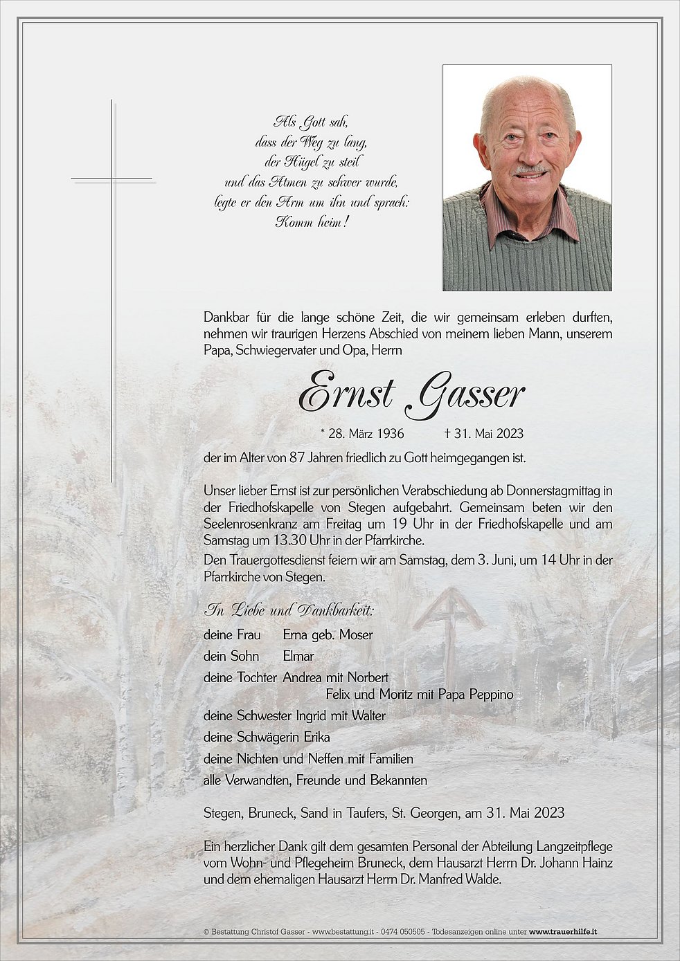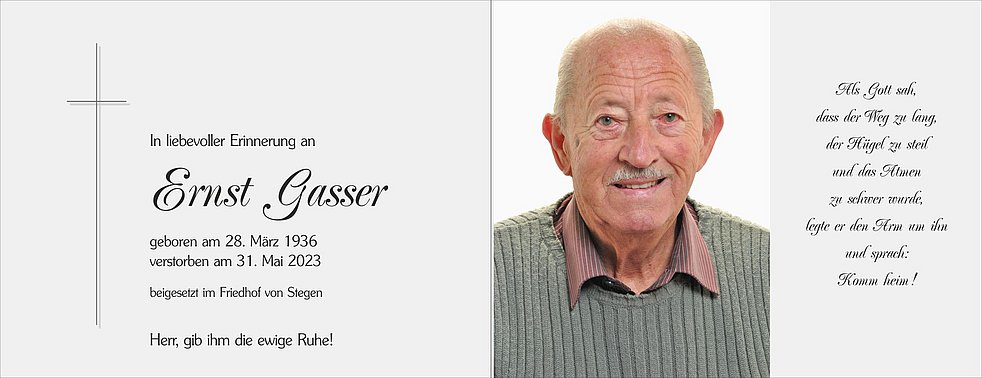 Unser lieber Ernst ist zur persönlichen Verabschiedung ab Donnerstagmittag in der Friedhofskapelle von Stegen aufgebahrt. Gemeinsam beten wir den Seelenrosenkranz am Freitag um 19 Uhr in der Friedhofskapelle und am Samstag um 13.30 Uhr in der Pfarrkirche.