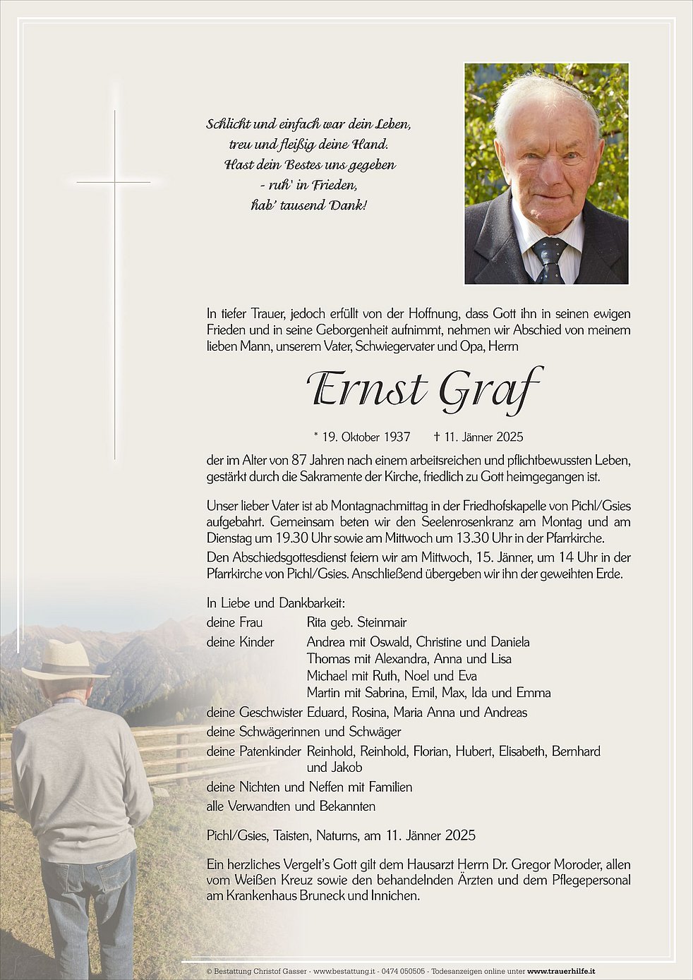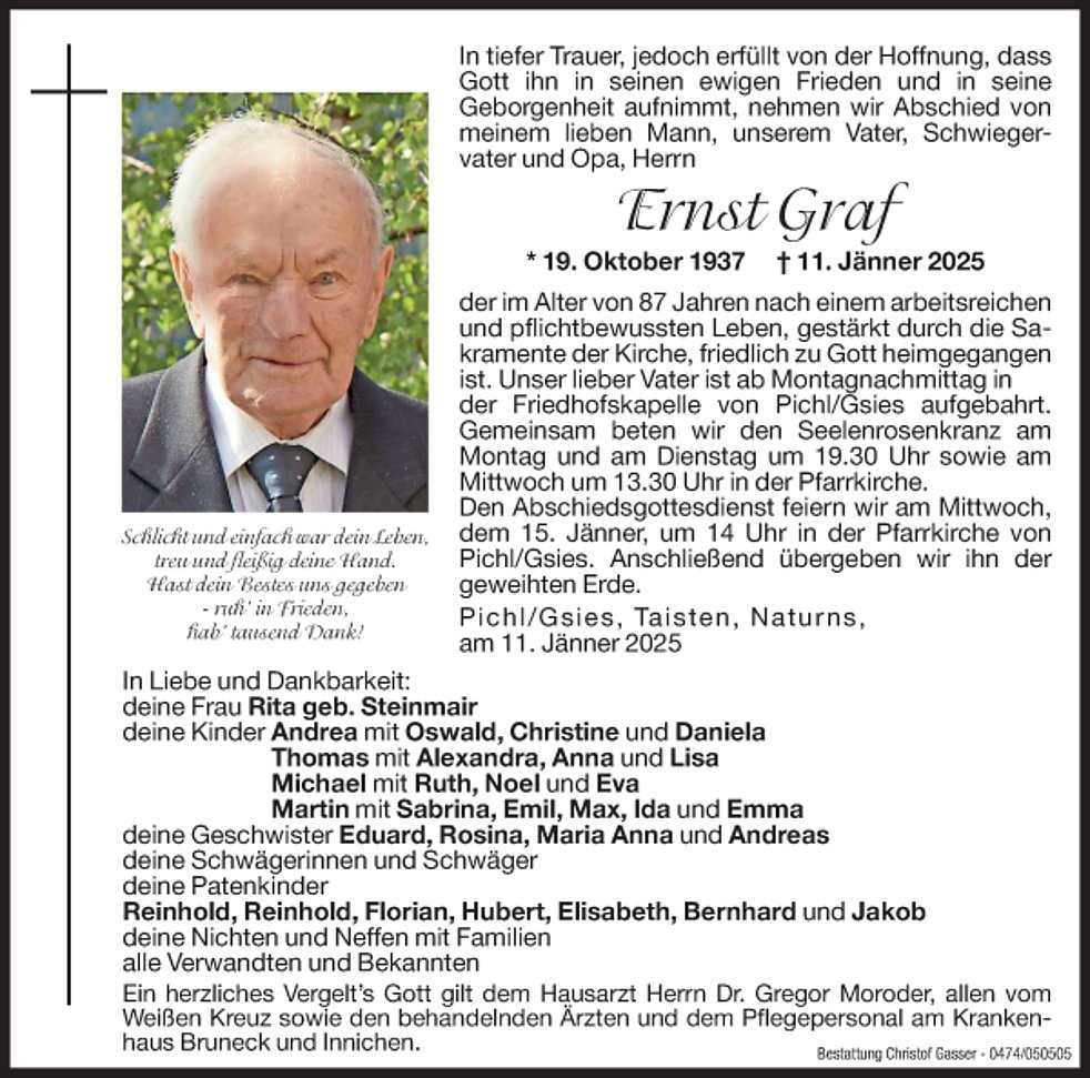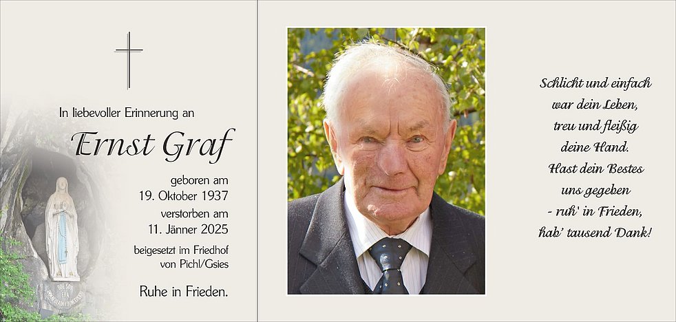 Den Abschiedsgottesdienst feiern wir am Mittwoch, 15. Jänner, um 14 Uhr in der Pfarrkirche von Pichl/Gsies. Anschließend übergeben wir ihn der geweihten Erde.