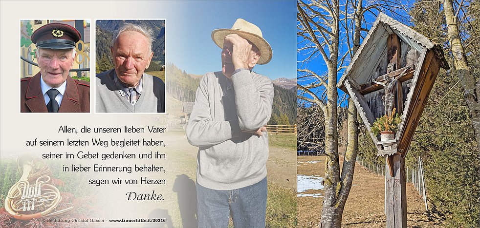 Ein herzliches Vergelt’s Gott gilt dem Hausarzt Herrn Dr. Gregor Moroder, allen vom Weißen Kreuz sowie den behandelnden Ärzten und dem Pflegepersonal am Krankenhaus Bruneck und Innichen.