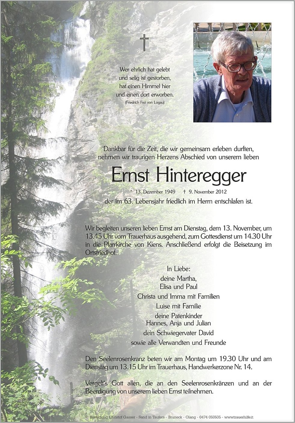Wir begleiten unseren lieben Ernst am Dienstag, dem 13. November, um 13.45 Uhr vom Trauerhaus ausgehend, zum Gottesdienst um 14.30 Uhr in die Pfarrkirche von Kiens. Anschließend erfolgt die Beisetzung im Ortsfriedhof.