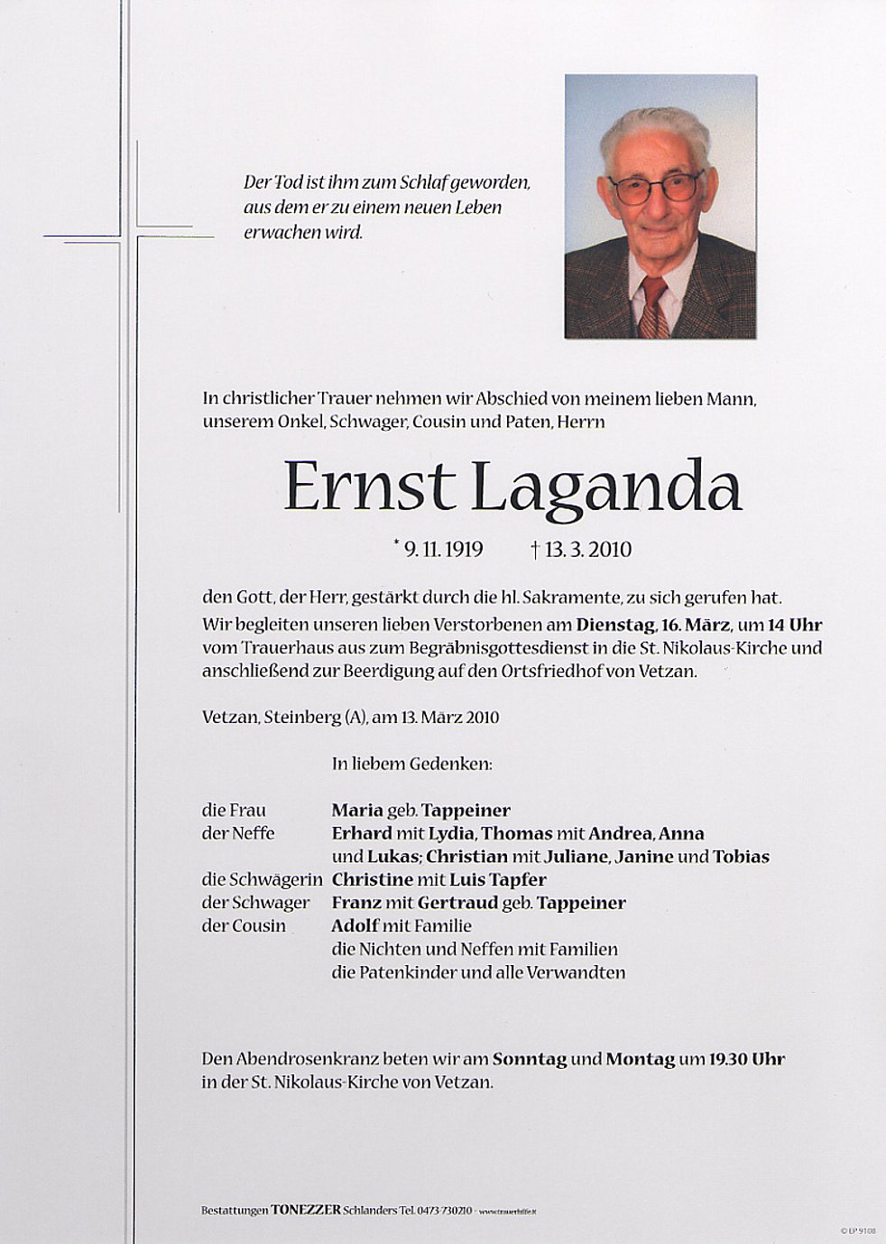 Wir begleiten unseren lieben Verstorbenen am Dienstag, 16. März, um 14 Uhr vom Trauerhaus aus zum Begräbnisgottesdienst in die St. Nikolaus-Kirche und anschließend zur Beerdigung auf den Ortsfriedhof von Vetzan.
