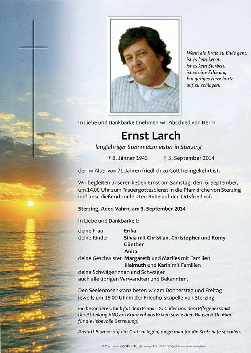 Anstatt Blumen auf das Grab zu legen, möge man für die Krebshilfe spenden.