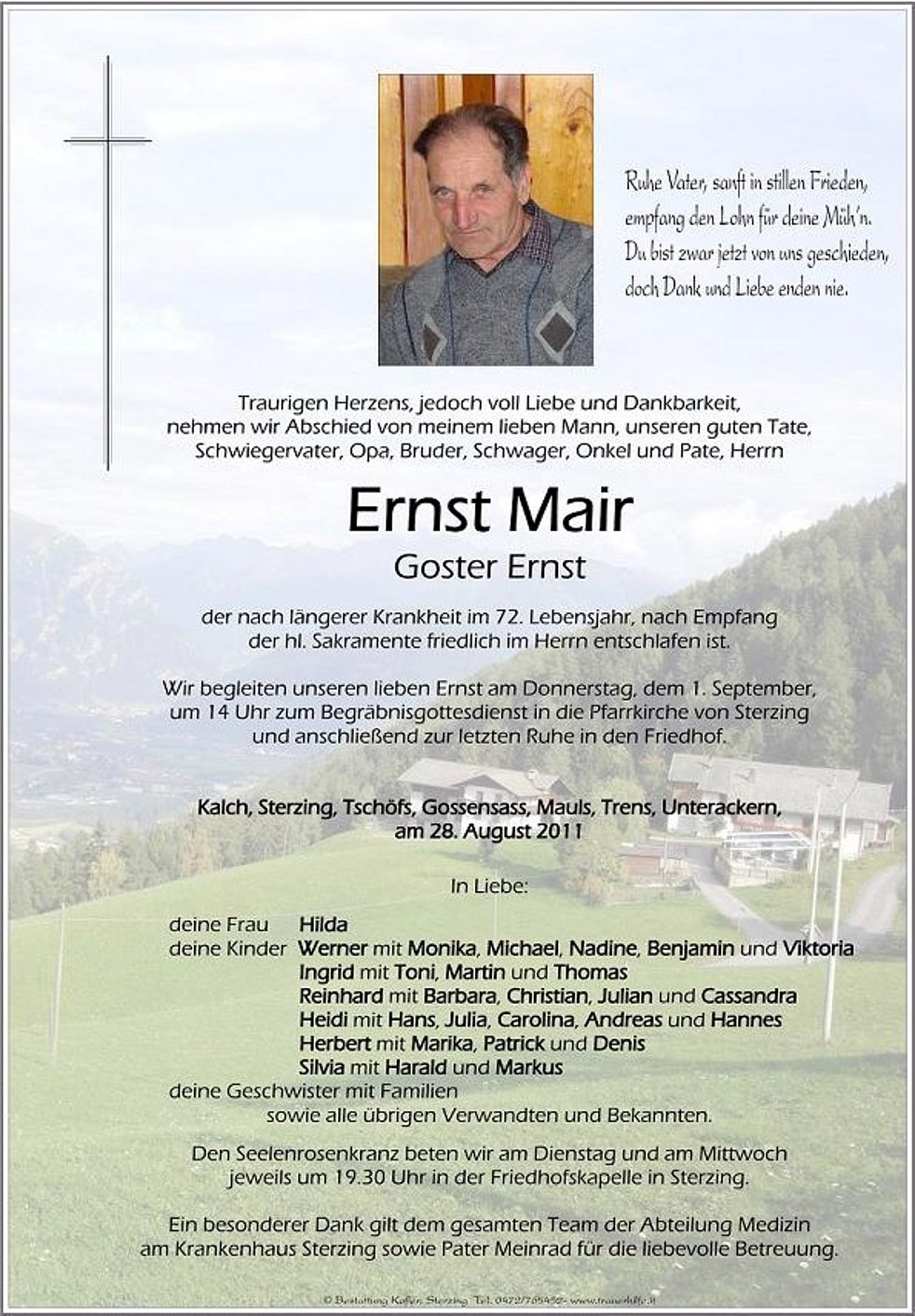 am Krankenhaus Sterzing sowie Pater Meinrad für die liebevolle Betreuung.