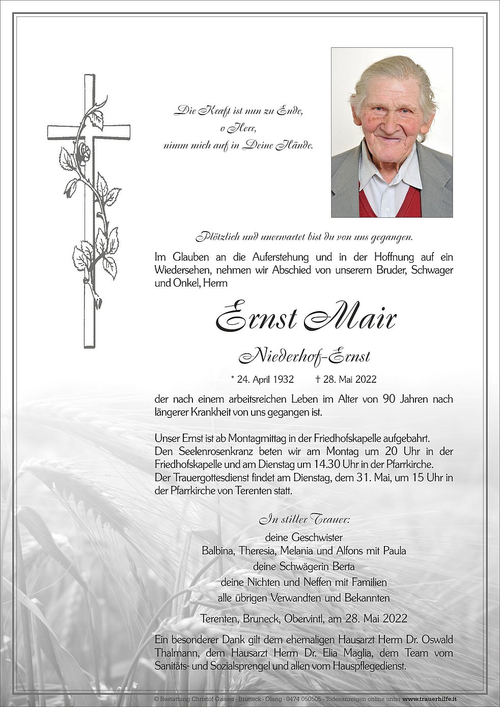 Der Trauergottesdienst findet am Dienstag, dem 31. Mai, um 15 Uhr in der Pfarrkirche von Terenten statt.