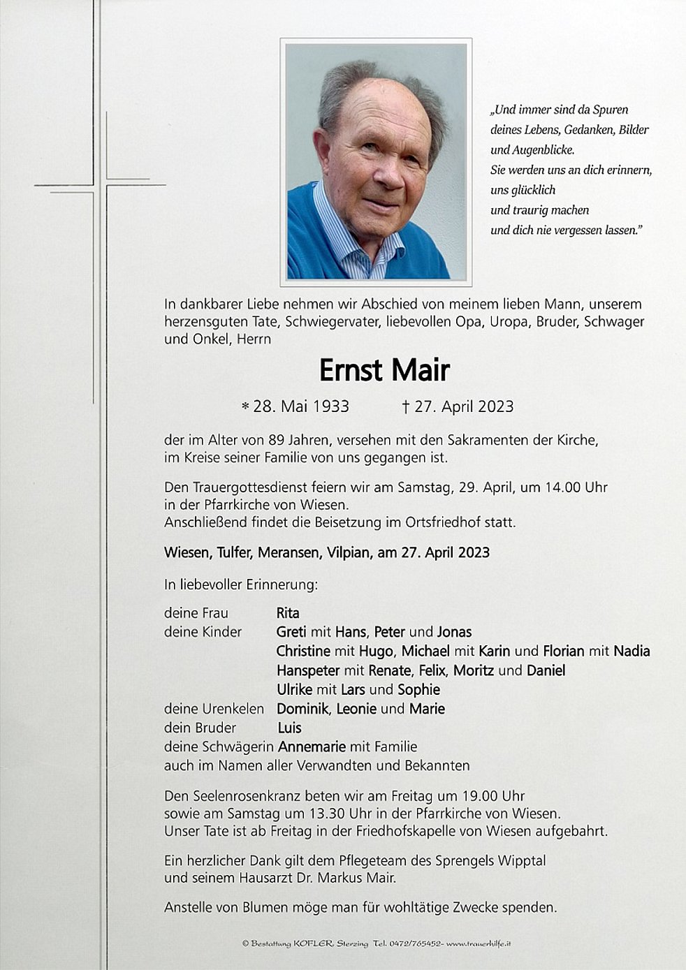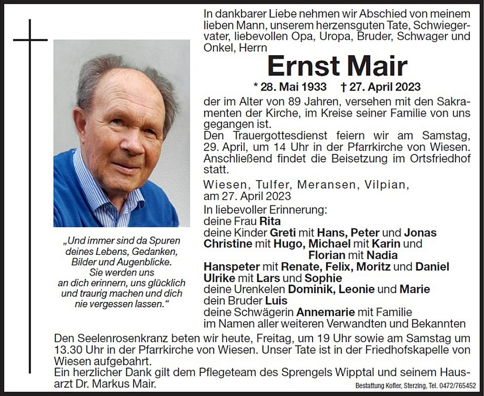 Den Trauergottesdienst feiern wir am Samstag, 29. April, um 14.00 Uhr in der Pfarrkirche von Wiesen. Anschließend findet die Beisetzung im Ortsfriedhof statt.